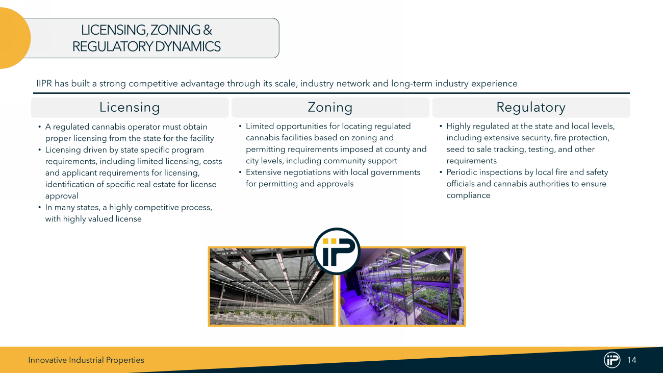 Innovative Industrial Properties 13 Institutions (by type) Providing Banking Services to MRBs (2) Institutional Adoption Continues Percentage of FDIC Banks that Offer Services to MRBs (1) INCREASED BANKING SERVICES FOR CANNABIS INDUSTRY Note : “MRB” refers to Marijuana Related Business, businesses that “manufacture,” “distribute” or “dispense” marijuana . (1) Treasury Department, FDIC data . (2) Treasury Department . - 2% 4% 6% 8% 10% 12% 2014 2015 2016 2017 2018 2019 2020 2021 2022 2023 505 178 132 0 100 200 300 400 500 600 1Q 2014 3Q 2014 1Q 2015 3Q 2015 1Q 2016 3Q 2016 1Q 2017 3Q 2017 1Q 2018 3Q 2018 1Q 2019 3Q 2019 1Q 2020 3Q 2020 1Q 2021 3Q 2021 1Q 2022 3Q 2022 1Q 2023 3Q 2023 1Q 2024 Banks Credit Unions Non-Depository • Increasing trend in FDIC banks offering services to marijuana - related business (“MRBs”) (from 2014 to 2023) reaching an all - time high of ~12% of the total number of banks in 2023 • Steady growth in the number of depository institutions supporting MRBs • ~800 banks, credit unions and other institutions providing services to marijuana - related businesses