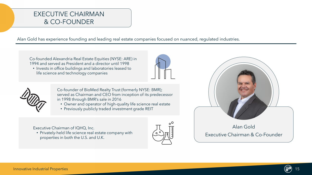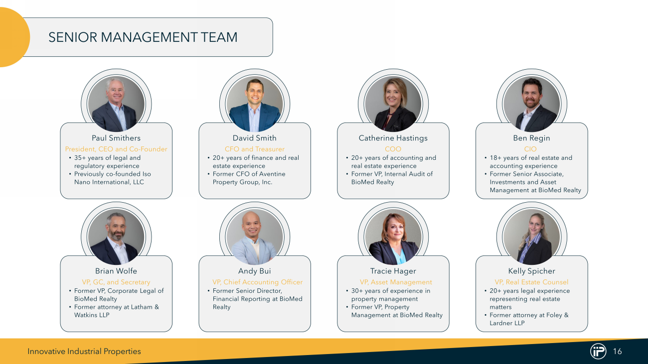 Innovative Industrial Properties 15 Alan Gold Executive Chairman & Co - Founder Co - founder of BioMed Realty Trust (formerly NYSE: BMR); served as Chairman and CEO from inception of its predecessor in 1998 through BMR’s sale in 2016 • Owner and operator of high - quality life science real estate • Previously publicly traded investment grade REIT Co - founded Alexandria Real Estate Equities (NYSE: ARE) in 1994 and served as President and a director until 1998 • Invests in office buildings and laboratories leased to life science and technology companies Executive Chairman of IQHQ, Inc. • Privately - held life science real estate company with properties in both the U.S. and U.K. EXECUTIVE CHAIRMAN & CO - FOUNDER Alan Gold has experience founding and leading real estate companies focused on nuanced, regulated industries.