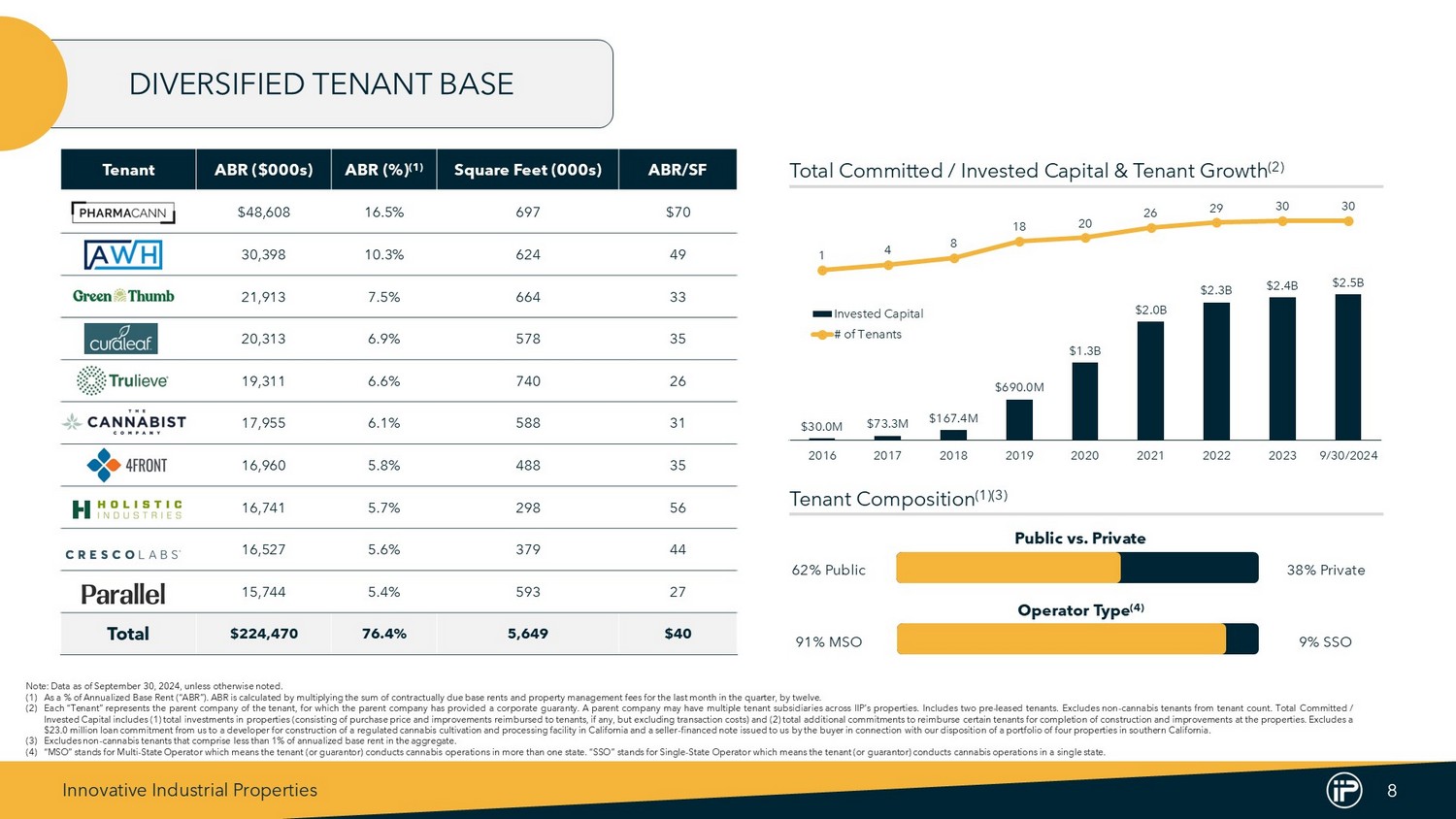 Innovative Industrial Properties 7 Balance Sheet Statistics $300.0 Million 2024 2025 2026 2027 2028 Thereafter Notes Due 2026 Debt Overview Revolving Credit Facility: • Entire $50.0M capacity is undrawn Unsecured Senior Notes: • Investment grade rating BBB+ from Egan Jones, since May 2021 • $300.0M of 5.50% unsecured senior notes due May 25, 2026 Capital Structure (2) Debt Maturity Profile Note : As of September 30 , 2024 , unless otherwise noted . (1) Calculated in accordance with the indenture governing the Notes due 2026 , included in the Current Report on Form 8 - K filed with the Securities and Exchange Commission on May 25 , 2021 . (2) Share price per S&P Capital IQ Pro as of 9 / 30 / 2024 . $0.0B $0.5B $1.0B $1.5B $2.0B $2.5B $3.0B $3.5B $4.0B $3.8B in Common Equity $25.1M in Preferred Equity $300.0M in Gross Debt 11% Debt to Total Gross Assets (1) 17x Debt Service Coverage Ratio (1) No Debt Maturities Until 2026 IIPR is One of the Lowest Leveraged Public REITs BALANCE SHEET HIGHLIGHTS