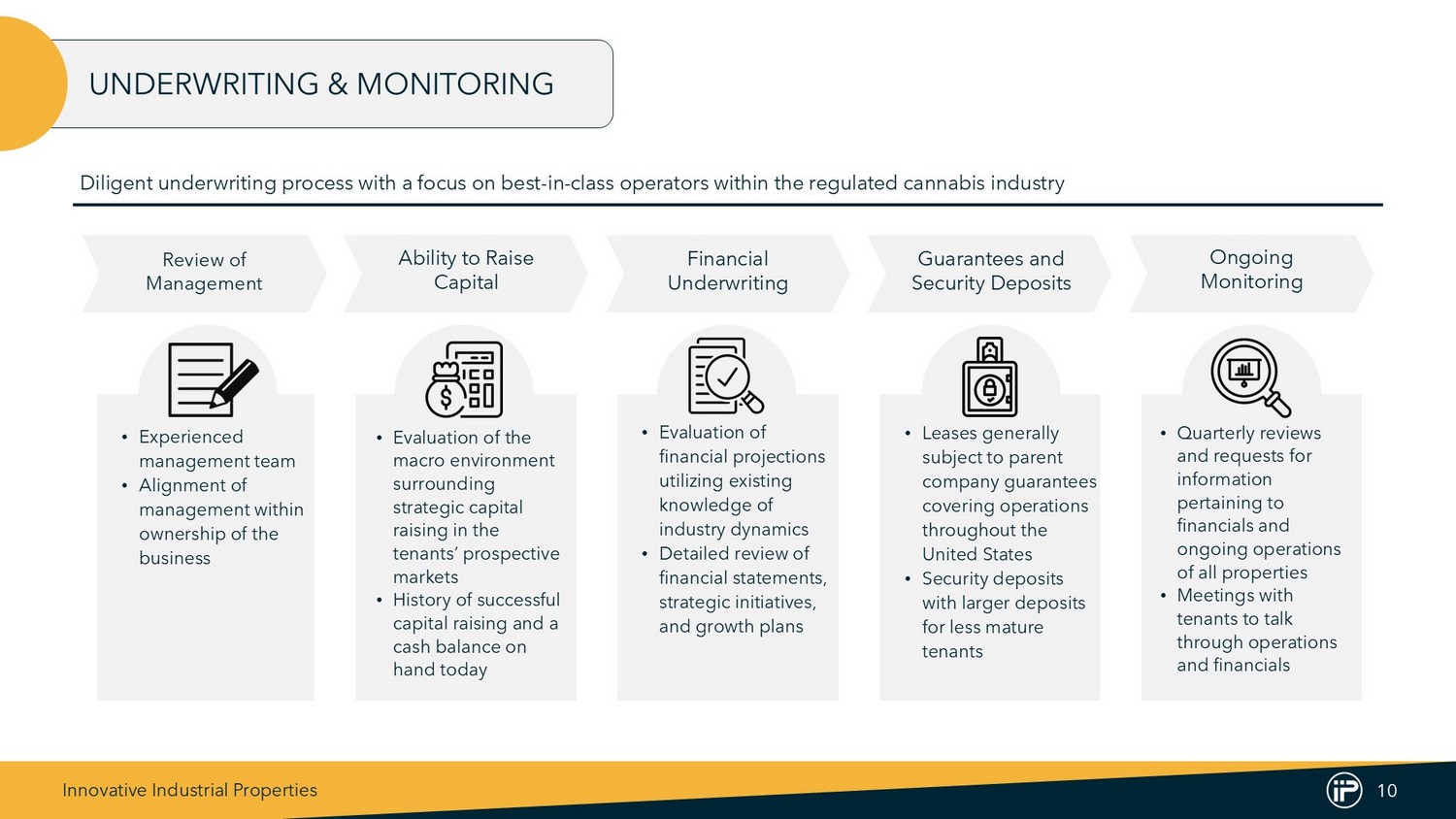 Innovative Industrial Properties 9 $0.55 $1.20 $2.83 $4.47 $5.72 $7.10 $7.22 $0.67 $1.34 $3.28 $5.01 $6.66 $8.45 $9.08 2017 2018 2019 2020 2021 2022 2023 Dividend/Share AFFO/Share HISTORICAL PERFORMANCE OF AFFO AND DIVIDENDS 80% 84% 86% 89% 86% 90% 82% AFFO Payout (3) : Annual AFFO Per Diluted Share CAGR (1,2) ‘17 – ’23: 54% Annual Dividend Per Share CAGR (2) ‘17 – ’23: 54% Average AFFO Payout Ratio ‘17 – ’23: 85% (1) Management believes that Adjusted Funds From Operations (“AFFO”) and AFFO per diluted share are appropriate supplemental measures of a REIT’s operating performance . See the company’s Quarterly Report on Form 10 - Q for the quarter ended September 30 , 2024 and Appendix A to the company’s proxy statement, as filed with the U . S . Securities and Exchange Commission on May 9 , 2024 and April 1 , 2024 , respectively, for definitions and a reconciliation of AFFO to GAAP net income attributable to common stockholders . (2) "CAGR" represents compound annualized growth rate for the relevant metric . (3) Calculated as dividends declared for the specified period divided by AFFO per diluted share .