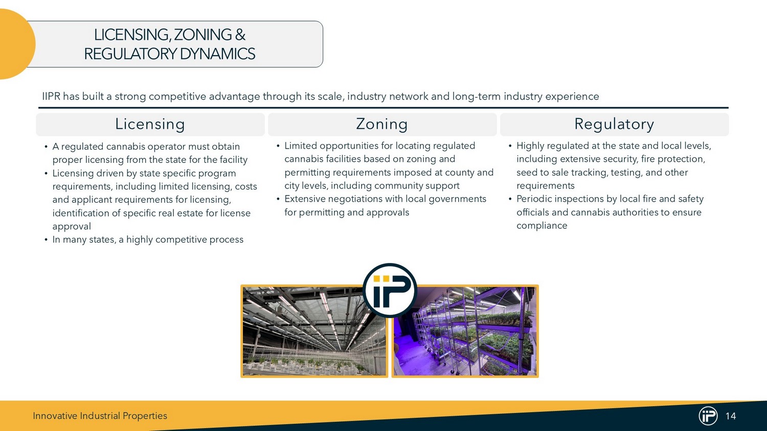 Innovative Industrial Properties 13 Institutions (by type) Providing Banking Services to MRBs (2) Institutional Adoption Continues Percentage of FDIC Banks that Offer Services to MRBs (1) INCREASED BANKING SERVICES FOR CANNABIS INDUSTRY Note : “MRB” refers to Marijuana Related Business, businesses that “manufacture,” “distribute” or “dispense” marijuana . (1) Treasury Department, FDIC data . (2) Treasury Department . - 2% 4% 6% 8% 10% 12% 2014 2015 2016 2017 2018 2019 2020 2021 2022 2023 515 173 143 0 100 200 300 400 500 600 1Q 2014 3Q 2014 1Q 2015 3Q 2015 1Q 2016 3Q 2016 1Q 2017 3Q 2017 1Q 2018 3Q 2018 1Q 2019 3Q 2019 1Q 2020 3Q 2020 1Q 2021 3Q 2021 1Q 2022 3Q 2022 1Q 2023 3Q 2023 1Q 2024 Banks Credit Unions Non-Depository • Increasing trend in FDIC banks offering services to marijuana - related business (“MRBs”) (from 2014 to 2023) reaching an all - time high of ~12% of the total number of banks in 2023 • Steady growth in the number of depository institutions supporting MRBs • ~800 banks, credit unions and other institutions providing services to marijuana - related businesses
