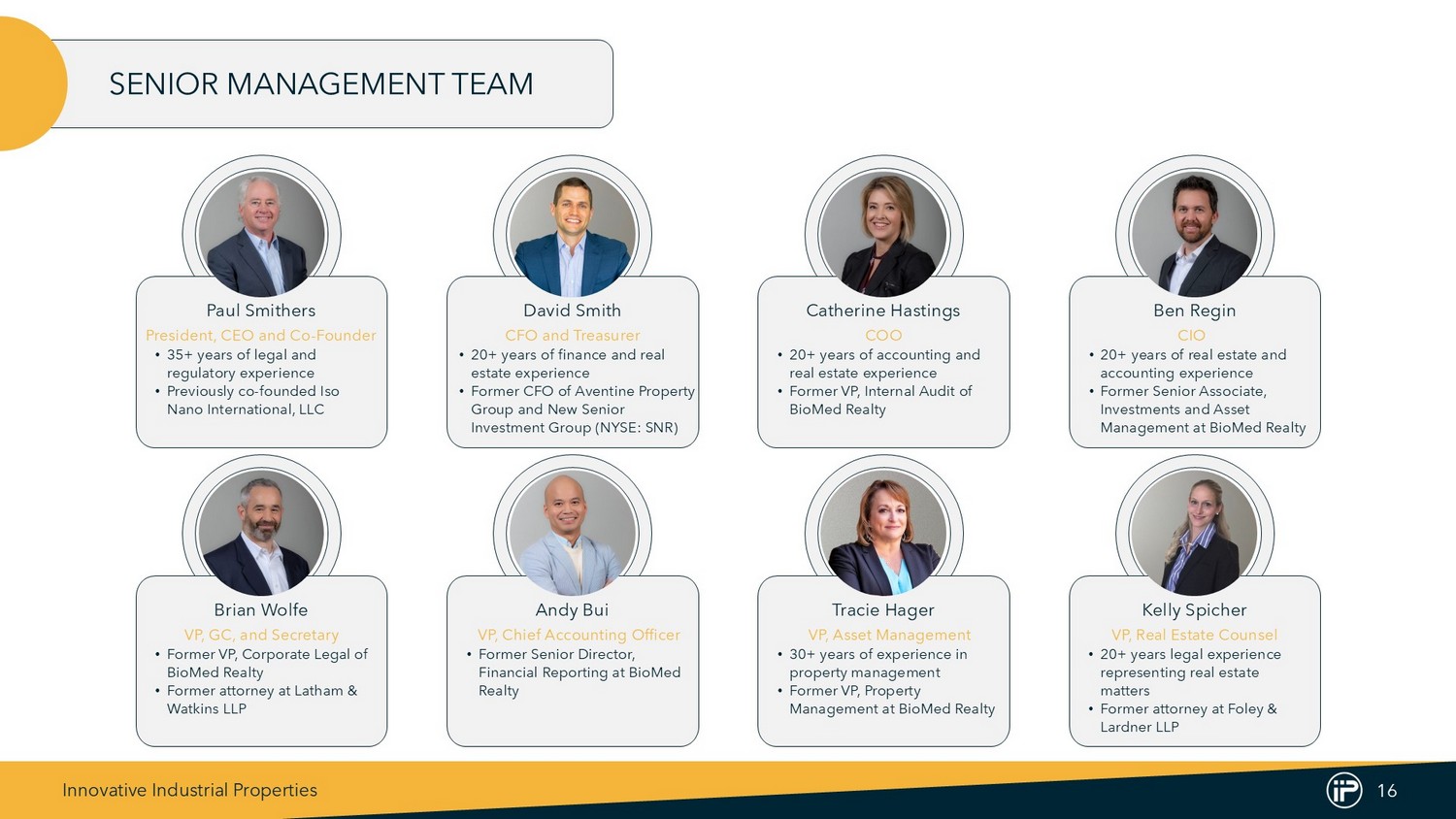 Innovative Industrial Properties 15 Alan Gold Executive Chairman & Co - Founder Co - founder of BioMed Realty Trust (formerly NYSE: BMR); served as Chairman and CEO from inception of its predecessor in 1998 through BMR’s sale in 2016 • Owner and operator of high - quality life science real estate • Previously publicly traded investment grade REIT Co - founded Alexandria Real Estate Equities (NYSE: ARE) in 1994 and served as President and a director until 1998 • Invests in office buildings and laboratories leased to life science and technology companies Executive Chairman of IQHQ, Inc. • Privately - held life science real estate company with properties in both the U.S. and U.K. EXECUTIVE CHAIRMAN & CO - FOUNDER Alan Gold has experience founding and leading real estate companies focused on nuanced, regulated industries.