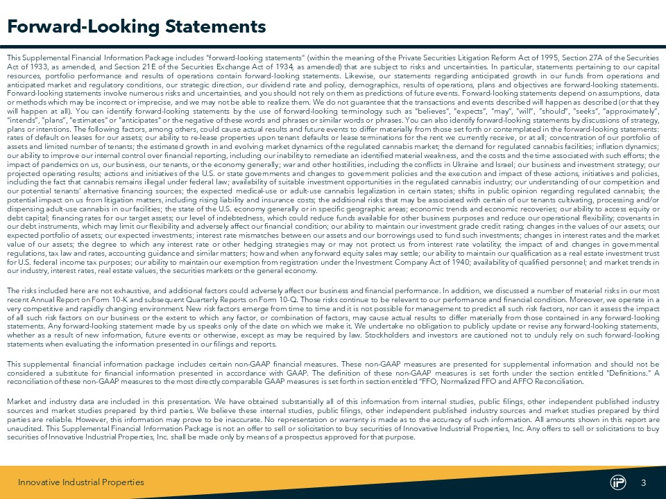 Innovative Industrial Properties 3 Forward - Looking Statements This Supplemental Financial Information Package includes "forward - looking statements" (within the meaning of the Private Securities Litigation Reform Act of 1995 , Section 27 A of the Securities Act of 1933 , as amended, and Section 21 E of the Securities Exchange Act of 1934 , as amended) that are subject to risks and uncertainties . In particular, statements pertaining to our capital resources, portfolio performance and results of operations contain forward - looking statements . Likewise, our statements regarding anticipated growth in our funds from operations and anticipated market and regulatory conditions, our strategic direction, our dividend rate and policy, demographics, results of operations, plans and objectives are forward - looking statements . Forward - looking statements involve numerous risks and uncertainties, and you should not rely on them as predictions of future events . Forward - looking statements depend on assumptions, data or methods which may be incorrect or imprecise, and we may not be able to realize them . We do not guarantee that the transactions and events described will happen as described (or that they will happen at all) . You can identify forward - looking statements by the use of forward - looking terminology such as "believes“, "expects“, "may“, "will“, "should“, "seeks“, "approximately“, "intends“, "plans“, "estimates" or "anticipates" or the negative of these words and phrases or similar words or phrases . You can also identify forward - looking statements by discussions of strategy, plans or intentions . The following factors, among others, could cause actual results and future events to differ materially from those set forth or contemplated in the forward - looking statements : rates of default on leases for our assets ; our ability to re - lease properties upon tenant defaults or lease terminations for the rent we currently receive, or at all ; concentration of our portfolio of assets and limited number of tenants ; the estimated growth in and evolving market dynamics of the regulated cannabis market ; the demand for regulated cannabis facilities ; inflation dynamics ; our ability to improve our internal control over financial reporting, including our inability to remediate an identified material weakness, and the costs and the time associated with such efforts ; the impact of pandemics on us, our business, our tenants, or the economy generally ; war and other hostilities, including the conflicts in Ukraine and Israel ; our business and investment strategy ; our projected operating results ; actions and initiatives of the U . S . or state governments and changes to government policies and the execution and impact of these actions, initiatives and policies, including the fact that cannabis remains illegal under federal law ; availability of suitable investment opportunities in the regulated cannabis industry ; our understanding of our competition and our potential tenants’ alternative financing sources ; the expected medical - use or adult - use cannabis legalization in certain states ; shifts in public opinion regarding regulated cannabis ; the potential impact on us from litigation matters, including rising liability and insurance costs ; the additional risks that may be associated with certain of our tenants cultivating, processing and/or dispensing adult - use cannabis in our facilities ; the state of the U . S . economy generally or in specific geographic areas ; economic trends and economic recoveries ; our ability to access equity or debt capital ; financing rates for our target assets ; our level of indebtedness, which could reduce funds available for other business purposes and reduce our operational flexibility ; covenants in our debt instruments, which may limit our flexibility and adversely affect our financial condition ; our ability to maintain our investment grade credit rating ; changes in the values of our assets ; our expected portfolio of assets ; our expected investments ; interest rate mismatches between our assets and our borrowings used to fund such investments ; changes in interest rates and the market value of our assets ; the degree to which any interest rate or other hedging strategies may or may not protect us from interest rate volatility ; the impact of and changes in governmental regulations, tax law and rates, accounting guidance and similar matters ; how and when any forward equity sales may settle ; our ability to maintain our qualification as a real estate investment trust for U . S . federal income tax purposes ; our ability to maintain our exemption from registration under the Investment Company Act of 1940 ; availability of qualified personnel ; and market trends in our industry, interest rates, real estate values, the securities markets or the general economy . The risks included here are not exhaustive, and additional factors could adversely affect our business and financial performance . In addition, we discussed a number of material risks in our most recent Annual Report on Form 10 - K and subsequent Quarterly Reports on Form 10 - Q . Those risks continue to be relevant to our performance and financial condition . Moreover, we operate in a very competitive and rapidly changing environment . New risk factors emerge from time to time and it is not possible for management to predict all such risk factors, nor can it assess the impact of all such risk factors on our business or the extent to which any factor, or combination of factors, may cause actual results to differ materially from those contained in any forward - looking statements . Any forward - looking statement made by us speaks only of the date on which we make it . We undertake no obligation to publicly update or revise any forward - looking statements, whether as a result of new information, future events or otherwise, except as may be required by law . Stockholde