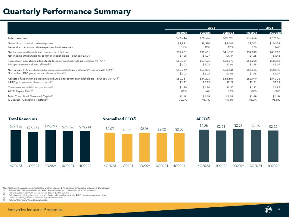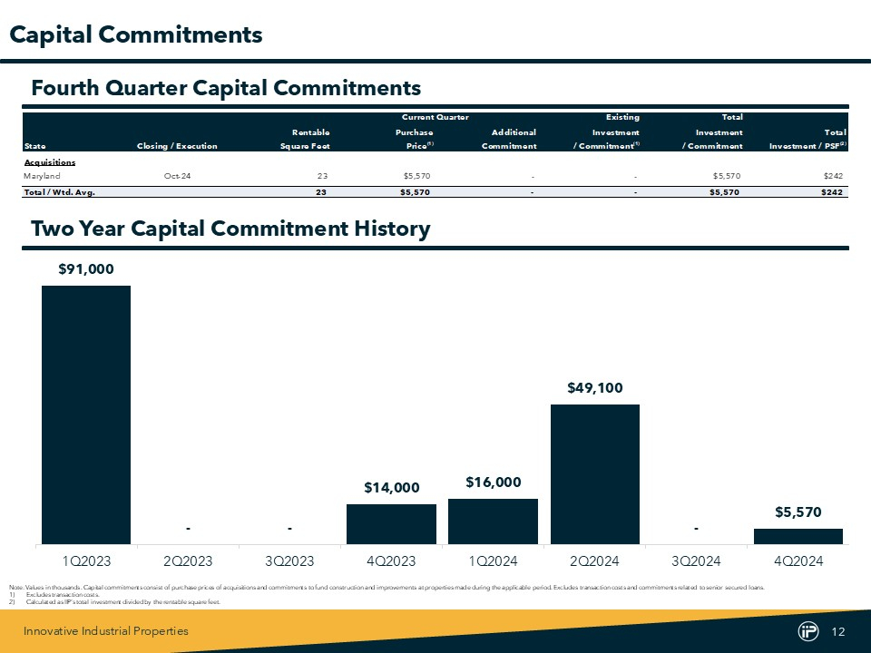 Innovative Industrial Properties 11 2024 2023 (In thousands, except share and per share amounts) 4Q2024 3Q2024 2Q2024 1Q2024 4Q2023 Net income attributable to common stockholders $39,461 $39,651 $41,655 $39,090 $41,295 Real estate depreciation and amortization 18,240 17,944 17,473 17,150 17,098 Disposition-contingent lease termination fee, net of loss on sale of real estate (1) - - (451) - - FFO attributable to common stockholders (basic) 57,701 57,595 58,677 56,240 58,393 Cash and non-cash interest expense on Exchangeable Senior Notes - - - 28 50 FFO attributable to common stockholders (diluted) 57,701 57,595 58,677 56,268 58,443 Litigation-related expense 268 210 164 146 152 Normalized FFO attributable to common stockholders (diluted) 57,969 57,805 58,841 56,414 58,595 Interest income on seller-financed note (2) 30 268 403 403 403 Deferred lease payments received on sales-type leases (3) 568 1,452 1,462 1,456 - Stock-based compensation 4,315 4,316 4,371 4,315 4,934 Non-cash interest expense 456 419 401 388 383 Above-market lease amortization 23 23 23 23 23 AFFO attributable to common stockholders (diluted) $63,361 $64,283 $65,501 $62,999 $64,338 FFO per common share – diluted $2.02 $2.02 $2.06 $1.98 $2.07 Normalized FFO per common share – diluted $2.03 $2.02 $2.06 $1.98 $2.07 AFFO per common share – diluted $2.22 $2.25 $2.29 $2.21 $2.28 Weighted average common shares outstanding – basic 28,254,565 28,254,565 28,250,843 28,145,017 27,996,393 Restricted stock and RSUs 299,770 299,770 300,582 278,890 206,667 PSUs - 25,352 20,713 - - Dilutive effect of Exchangeable Senior Notes - - - 38,079 76,774 Weighted average common shares outstanding – diluted 28,554,335 28,579,687 28,572,138 28,461,986 28,279,834 Historical FFO, Normalized FFO, and AFFO Reconciliation 1) Amount reflects the $ 3 . 9 million disposition - contingent lease termination fee received concurrently with the sale of our property in Los Angeles, California, net of the loss on sale of real estate of $ 3 . 4 million . 2) Amount reflects the non - refundable interest paid on the seller - financed note issued to us by the buyer in connection with our disposition of a portfolio of four properties in southern California previously leased to affiliates of Vertical, which is recognized as a deposit liability and is included in other liabilities in our consolidated balance sheet as of December 31 , 2023 and 2024 , as the transaction did not qualify for recognition as a completed sale . 3) Amount reflects the non - refundable lease payments received on two sales - type leases which are recognized as a deposit liability starting on January 1 , 2024 , and is included in other liabilities in our consolidated balance sheet as of December 31 , 2024 , as the transaction did not qualify for recognition as a completed sale . Prior to the lease modifications on January 1 , 2024 , which extended the initial lease terms, the leases were classified as operating leases and the lease payments received were recognized as rental revenue and therefore, included in net income attributable to common stockholders .