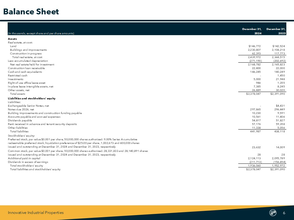 Innovative Industrial Properties 6 December 31, December 31, (In thousands, except share and per share amounts) 2024 2023 Assets Real estate, at cost: Land $146,772 $142,524 Buildings and improvements 2,230,807 2,108,218 Construction in progress 62,393 117,773 Total real estate, at cost 2,439,972 2,368,515 Less accumulated depreciation (271,190) (202,692) Net real estate held for investment 2,168,782 2,165,823 Construction loan receivable 22,800 22,000 Cash and cash equivalents 146,245 140,249 Restricted cash - 1,450 Investments 5,000 21,948 Right of use office lease asset 946 1,355 In-place lease intangible assets, net 7,385 8,245 Other assets, net 26,889 30,020 Total assets $2,378,047 $2,391,090 Liabilities and stockholders’ equity Liabilities: Exchangeable Senior Notes, net - $4,431 Notes due 2026, net 297,865 296,449 Building improvements and construction funding payable 10,230 9,591 Accounts payable and accrued expenses 10,561 11,406 Dividends payable 54,817 51,827 Rent received in advance and tenant security deposits 57,176 59,358 Other liabilities 11,338 5,056 Total liabilities 441,987 438,118 Stockholders’ equity: Preferred stock, par value $0.001 per share, 50,000,000 shares authorized: 9.00% Series A cumulative redeemable preferred stock, liquidation preference of $25.00 per share, 1,002,673 and 600,000 shares issued and outstanding at December 31, 2024 and December 31, 2023, respectively 23,632 14,009 Common stock, par value $0.001 per share, 50,000,000 shares authorized: 28,331,833 and 28,140,891 shares issued and outstanding at December 31, 2024 and December 31, 2023, respectively 28 28 Additional paid-in capital 2,124,113 2,095,789 Dividends in excess of earnings (211,713) (156,854) Total stockholders’ equity 1,936,060 1,952,972 Total liabilities and stockholders ’ equity $2,378,047 $2,391,090 Balance Sheet