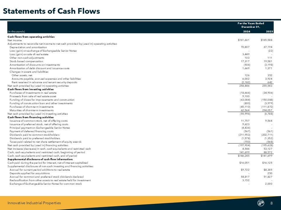 Innovative Industrial Properties 8 For the Years Ended December 31, (In thousands) 2024 2023 Cash flows from operating activities Net income $161,661 $165,588 Adjustments to reconcile net income to net cash provided by (used in) operating activities Depreciation and amortization 70,807 67,194 Loss (gain) on exchange of Exchangeable Senior Notes - (22) Loss (gain) on sale of real estate 3,449 - Other non-cash adjustments 103 111 Stock-based compensation 17,317 19,581 Amortization of discounts on investments (506) (3,198) Amortization of debt discount and issuance costs 1,669 1,371 Changes in assets and liabilities Other assets, net 126 352 Accounts payable, accrued expenses and other liabilities 6,002 3,924 Rent received in advance and tenant security deposits (2,182) 642 Net cash provided by (used in) operating activities 258,446 255,543 Cash flows from investing activities Purchases of investments in real estate (18,666) (34,906) Proceeds from sale of real estate asset 9,100 - Funding of draws for improvements and construction (63,084) (150,088) Funding of construction loan and other investments (800) (3,979) Purchases of short-term investments (45,110) (111,872) Maturities of short-term investments 62,564 294,057 Net cash provided by (used in) investing activities (55,996) (6,788) Cash flows from financing activities Issuance of common stock, net of offering costs 11,757 9,564 Issuance of preferred stock, net of offering costs 9,623 - Principal payment on Exchangeable Senior Notes (4,436) - Payment of deferred financing costs (567) (561) Dividends paid to common stockholders (211,953) (202,711) Dividends paid to preferred stockholders (1,578) (1,352) Taxes paid related to net share settlement of equity awards (750) (568) Net cash provided by (used in) financing activities (197,904) (195,628) Net increase (decrease) in cash, cash equivalents and restricted cash 4,546 53,127 Cash, cash equivalents and restricted cash, beginning of period 141,699 88,572 Cash, cash equivalents and restricted cash, end of period $146,245 $141,699 Supplemental disclosure of cash flow information: Cash paid during the period for interest, net of interest capitalized $16,051 $16,125 Supplemental disclosure of non-cash investing and financing activities: Accrual for current-period additions to real estate $9,722 $8,385 Deposits applied for acquisitions - 250 Accrual for common and preferred stock dividends declared 54,817 51,827 Reclassification from other assets to real estate held for investment 3,152 - Exchange of Exchangeable Senior Notes for common stock - 2,000 Statements of Cash Flows