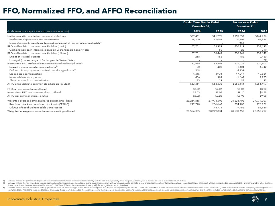 Innovative Industrial Properties 9 For the Three Months Ended For the Years Ended December 31, December 31, (In thousands, except share and per share amounts) 2024 2023 2024 2023 Net income attributable to common stockholders $39,461 $41,295 $159,857 $164,236 Real estate depreciation and amortization 18,240 17,098 70,807 67,194 Disposition-contingent lease termination fee, net of loss on sale of real estate (1) - - (451) - FFO attributable to common stockholders (basic) 57,701 58,393 230,213 231,430 Cash and non-cash interest expense on Exchangeable Senior Notes - 50 28 219 FFO attributable to common stockholders (diluted) 57,701 58,443 230,241 231,649 Litigation-related expense 268 152 788 2,480 Loss (gain) on exchange of Exchangeable Senior Notes - - - (22) Normalized FFO attributable to common stockholders (diluted) 57,969 58,595 231,029 234,107 Interest income on seller-financed note (2) 30 403 1,104 1,342 Deferred lease payments received on sales-type leases (3) 568 - 4,938 - Stock-based compensation 4,315 4,934 17,317 19,581 Non-cash interest expense 456 383 1,664 1,375 Above-market lease amortization 23 23 92 92 AFFO attributable to common stockholders (diluted) $63,361 $64,338 $256,144 $256,497 FFO per common share – diluted $2.02 $2.07 $8.07 $8.20 Normalized FFO per common share – diluted $2.03 $2.07 $8.10 $8.29 AFFO per common share – diluted $2.22 $2.28 $8.98 $9.08 Weighted average common shares outstanding – basic 28,254,565 27,996,393 28,226,402 27,977,807 Restricted stock and restricted stock units ("RSUs") 299,770 206,667 294,780 196,821 Dilutive effect of Exchangeable Senior Notes - 76,774 9,468 81,169 Weighted average common shares outstanding – diluted 28,554,335 28,279,834 28,530,650 28,255,797 FFO, Normalized FFO, and AFFO Reconciliation 1) Amount reflects the $ 3 . 9 million disposition - contingent lease termination fee received concurrently with the sale of our property in Los Angeles, California, net of the loss on sale of real estate of $ 3 . 4 million . 2) Amount reflects the non - refundable interest paid on the seller - financed note issued to us by the buyer in connection with our disposition of a portfolio of four properties in southern California previously leased to affiliates of Vertical, which is recognized as a deposit liability and is included in other liabilities in our consolidated balance sheet as of December 31 , 2023 and 2024 , as the transaction did not qualify for recognition as a completed sale . 3) Amount reflects the non - refundable lease payments received on two sales - type leases which are recognized as a deposit liability starting on January 1 , 2024 , and is included in other liabilities in our consolidated balance sheet as of December 31 , 2024 , as the transaction did not qualify for recognition as a completed sale . Prior to the lease modifications on January 1 , 2024 , which extended the initial lease terms, the leases were classified as operating leases and the lease payments received were recognized as rental revenue and therefore, included in net income attributable to common stockholders .