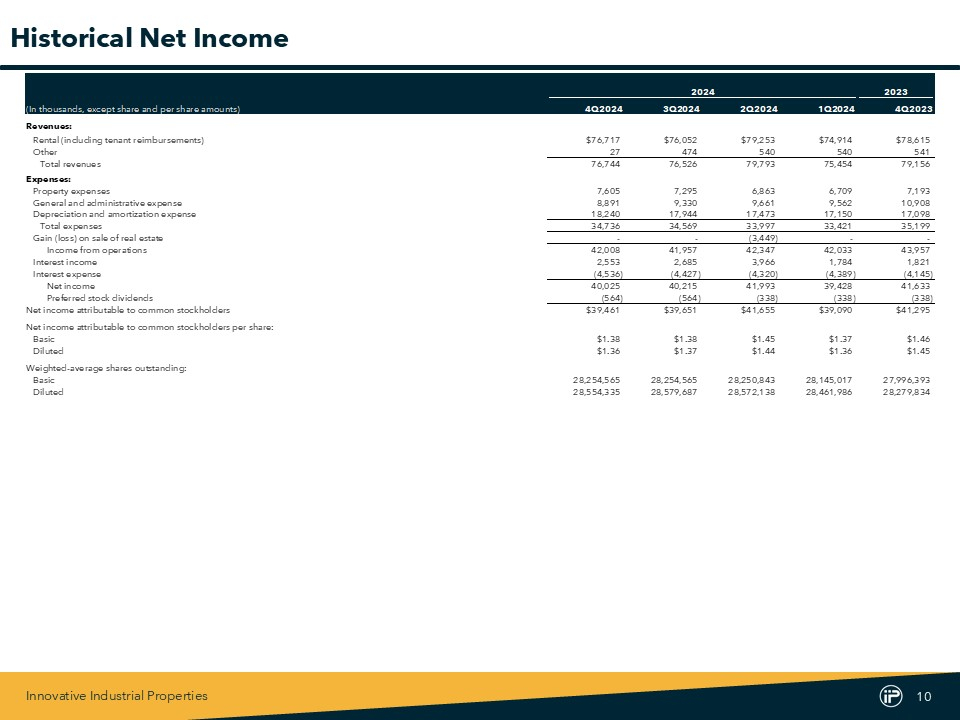 Innovative Industrial Properties 10 2024 2023 (In thousands, except share and per share amounts) 4Q2024 3Q2024 2Q2024 1Q2024 4Q2023 Revenues: Rental (including tenant reimbursements) $76,717 $76,052 $79,253 $74,914 $78,615 Other 27 474 540 540 541 Total revenues 76,744 76,526 79,793 75,454 79,156 Expenses: Property expenses 7,605 7,295 6,863 6,709 7,193 General and administrative expense 8,891 9,330 9,661 9,562 10,908 Depreciation and amortization expense 18,240 17,944 17,473 17,150 17,098 Total expenses 34,736 34,569 33,997 33,421 35,199 Gain (loss) on sale of real estate - - (3,449) - - Income from operations 42,008 41,957 42,347 42,033 43,957 Interest income 2,553 2,685 3,966 1,784 1,821 Interest expense (4,536) (4,427) (4,320) (4,389) (4,145) Net income 40,025 40,215 41,993 39,428 41,633 Preferred stock dividends (564) (564) (338) (338) (338) Net income attributable to common stockholders $39,461 $39,651 $41,655 $39,090 $41,295 Net income attributable to common stockholders per share: Basic $1.38 $1.38 $1.45 $1.37 $1.46 Diluted $1.36 $1.37 $1.44 $1.36 $1.45 Weighted-average shares outstanding: Basic 28,254,565 28,254,565 28,250,843 28,145,017 27,996,393 Diluted 28,554,335 28,579,687 28,572,138 28,461,986 28,279,834 Historical Net Income