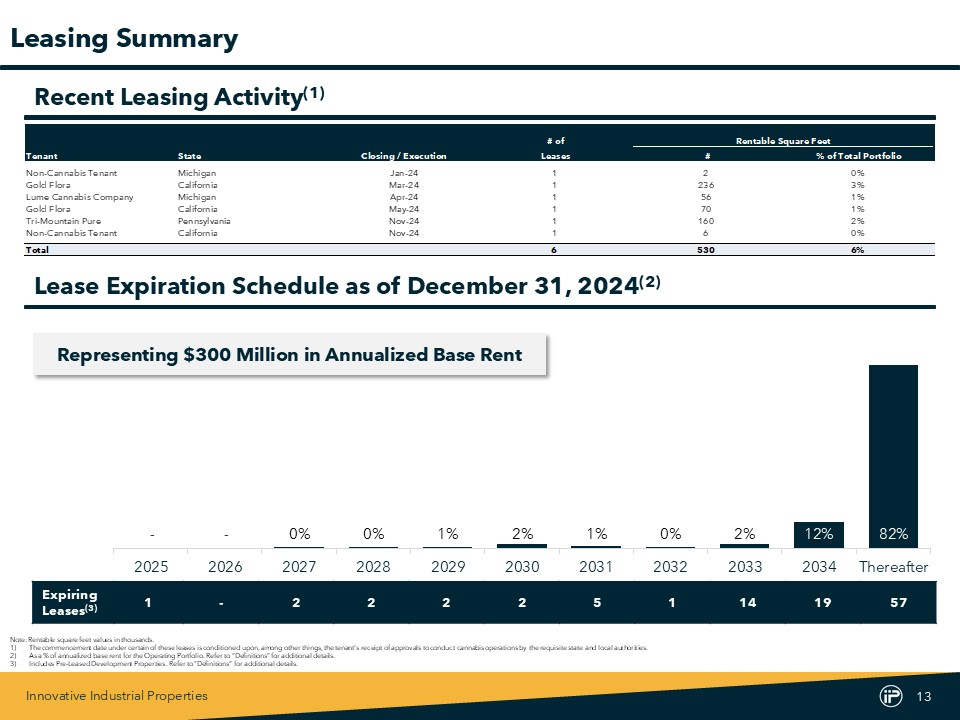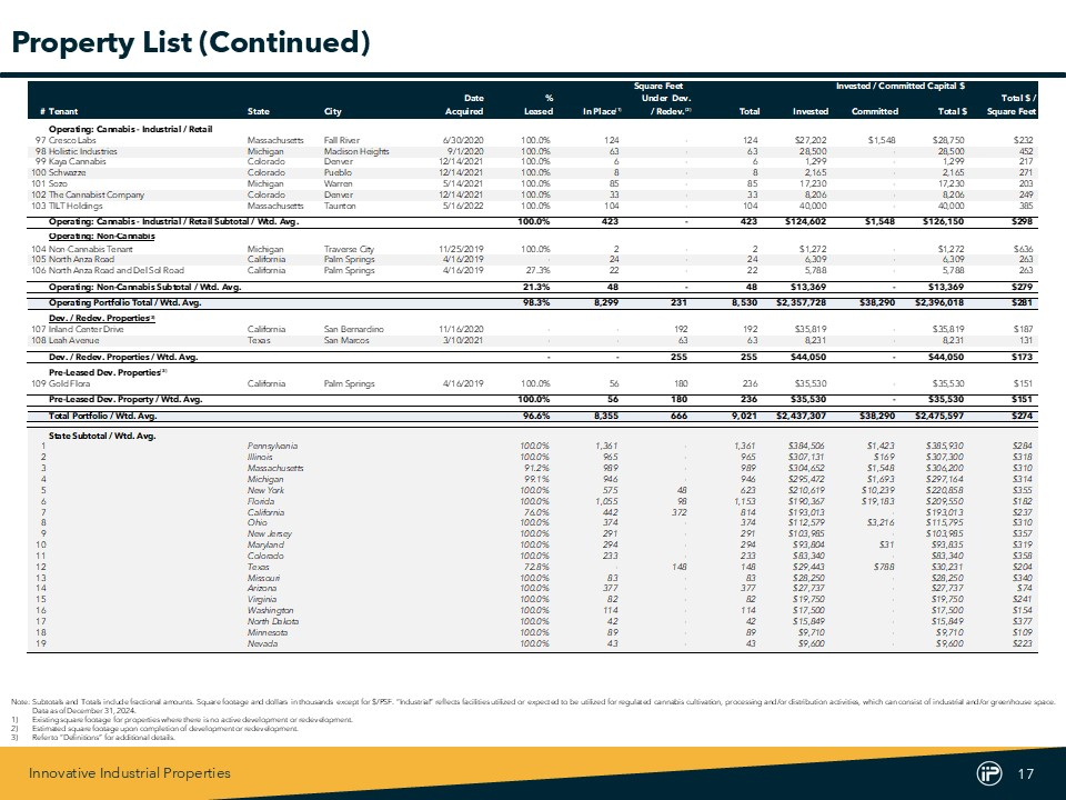 Innovative Industrial Properties 17 Square Feet Invested / Committed Capital $ Date % Under Dev. Total $ / #Tenant State City Acquired Leased In Place (1) / Redev. (2) Total Invested Committed Total $ Square Feet Operating: Cannabis - Industrial / Retail 97Cresco Labs Massachusetts Fall River 6/30/2020 100.0% 124 - 124 $27,202 $1,548 $28,750 $232 98Holistic Industries Michigan Madison Heights 9/1/2020 100.0% 63 - 63 28,500 - 28,500 452 99Kaya Cannabis Colorado Denver 12/14/2021 100.0% 6 - 6 1,299 - 1,299 217 100 Schwazze Colorado Pueblo 12/14/2021 100.0% 8 - 8 2,165 - 2,165 271 101 Sozo Michigan Warren 5/14/2021 100.0% 85 - 85 17,230 - 17,230 203 102 The Cannabist Company Colorado Denver 12/14/2021 100.0% 33 - 33 8,206 - 8,206 249 103 TILT Holdings Massachusetts Taunton 5/16/2022 100.0% 104 - 104 40,000 - 40,000 385 Operating: Cannabis - Industrial / Retail Subtotal / Wtd. Avg. 100.0% 423 - 423 $124,602 $1,548 $126,150 $298 Operating: Non-Cannabis 104 Non-Cannabis Tenant Michigan Traverse City 11/25/2019 100.0% 2 - 2 $1,272 - $1,272 $636 105 North Anza Road California Palm Springs 4/16/2019 - 24 - 24 6,309 - 6,309 263 106 North Anza Road and Del Sol Road California Palm Springs 4/16/2019 27.3% 22 - 22 5,788 - 5,788 263 Operating: Non-Cannabis Subtotal / Wtd. Avg. 21.3% 48 - 48 $13,369 - $13,369 $279 Operating Portfolio Total / Wtd. Avg. 98.3% 8,299 231 8,530 $2,357,728 $38,290 $2,396,018 $281 Dev. / Redev. Properties (3) 107 Inland Center Drive California San Bernardino 11/16/2020 - - 192 192 $35,819 - $35,819 $187 108 Leah Avenue Texas San Marcos 3/10/2021 - - 63 63 8,231 - 8,231 131 Dev. / Redev. Properties / Wtd. Avg. - - 255 255 $44,050 - $44,050 $173 Pre-Leased Dev. Properties (3) 109 Gold Flora California Palm Springs 4/16/2019 100.0% 56 180 236 $35,530 - $35,530 $151 Pre-Leased Dev. Property / Wtd. Avg. 100.0% 56 180 236 $35,530 - $35,530 $151 Total Portfolio / Wtd. Avg. 96.6% 8,355 666 9,021 $2,437,307 $38,290 $2,475,597 $274 State Subtotal / Wtd. Avg. 1 Pennsylvania 100.0% 1,361 - 1,361 $384,506 $1,423 $385,930 $284 2 Illinois 100.0% 965 - 965 $307,131 $169 $307,300 $318 3 Massachusetts 91.2% 989 - 989 $304,652 $1,548 $306,200 $310 4 Michigan 99.1% 946 - 946 $295,472 $1,693 $297,164 $314 5 New York 100.0% 575 48 623 $210,619 $10,239 $220,858 $355 6 Florida 100.0% 1,055 98 1,153 $190,367 $19,183 $209,550 $182 7 California 76.0% 442 372 814 $193,013 - $193,013 $237 8 Ohio 100.0% 374 - 374 $112,579 $3,216 $115,795 $310 9 New Jersey 100.0% 291 - 291 $103,985 - $103,985 $357 10 Maryland 100.0% 294 - 294 $93,804 $31 $93,835 $319 11 Colorado 100.0% 233 - 233 $83,340 - $83,340 $358 12 Texas 72.8% - 148 148 $29,443 $788 $30,231 $204 13 Missouri 100.0% 83 - 83 $28,250 - $28,250 $340 14 Arizona 100.0% 377 - 377 $27,737 - $27,737 $74 15 Virginia 100.0% 82 - 82 $19,750 - $19,750 $241 16 Washington 100.0% 114 - 114 $17,500 - $17,500 $154 17 North Dakota 100.0% 42 - 42 $15,849 - $15,849 $377 18 Minnesota 100.0% 89 - 89 $9,710 - $9,710 $109 19 Nevada 100.0% 43 - 43 $9,600 - $9,600 $223 Property List (Continued) Note : Subtotals and Totals include fractional amounts . Square footage and dollars in thousands except for $ /PSF . “Industrial” reflects facilities utilized or expected to be utilized for regulated cannabis cultivation, processing and/or distribution activities, which can consist of industrial and/or greenhouse space . Data as of December 31 , 2024 . 1) Existing square footage for properties where there is no active development or redevelopment . 2) Estimated square footage upon completion of development or redevelopment . 3) Refer to “Definitions” for additional details .