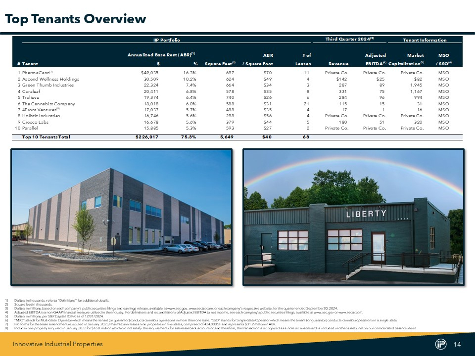 Innovative Industrial Properties 14 IIP Portfolio Third Quarter 2024 (3) Tenant Information Annualized Base Rent (ABR) (1) ABR # of Adjusted Market MSO #Tenant $ % Square Feet (2) / Square Foot Leases Revenue EBITDA (4) Capitalization (5) / SSO (6) 1 PharmaCann (7) $49,035 16.3% 697 $70 11 Private Co. Private Co. Private Co. MSO 2Ascend Wellness Holdings 30,509 10.2% 624 $49 4 $142 $25 $82 MSO 3Green Thumb Industries 22,324 7.4% 664 $34 3 287 89 1,945 MSO 4Curaleaf 20,411 6.8% 578 $35 8 331 75 1,167 MSO 5Trulieve 19,374 6.4% 740 $26 6 284 96 994 MSO 6The Cannabist Company 18,018 6.0% 588 $31 21 115 15 31 MSO 7 4Front Ventures (8) 17,037 5.7% 488 $35 4 17 1 16 MSO 8Holistic Industries 16,746 5.6% 298 $56 4 Private Co. Private Co. Private Co. MSO 9Cresco Labs 16,678 5.6% 379 $44 5 180 51 320 MSO 10Parallel 15,885 5.3% 593 $27 2 Private Co. Private Co. Private Co. MSO Top 10 Tenants Total $226,017 75.3% 5,649 $40 68 Top Tenants Overview 1) Dollars in thousands, r efer to “Definitions” for additional details . 2) Square feet in thousands . 3) Dollars in millions, based on each company’s public securities filings and earnings release, available at www . sec . gov, www . sedar . com, or each company’s respective website, for the quarter ended September 30 , 2024 . 4) Adjusted EBITDA is a non - GAAP financial measure utilized in the industry . For definitions and reconciliations of Adjusted EBITDA to net income, see each company’s public securities filings, available at www . sec . gov or www . sedar . com . 5) Dollars in millions, per S&P Capital IQ Pro as of 12 / 31 / 2024 . 6) “MSO” stands for Multi - State Operator which means the tenant (or guarantor) conducts cannabis operations in more than one state . “SSO” stands for Single - State O perator which means the tenant (or guarantor) conducts cannabis operations in a single state . 7) Pro forma for the lease amendments executed in January 2025 , PharmaCann leases nine properties in five states, comprised of 434 , 000 SF and represents $ 31 . 2 million in ABR . 8) Includes one property acquired in January 2022 for $ 16 . 0 million which did not satisfy the requirements for sale - leaseback accounting and therefore, the transaction is recognized as a note receivable and is included in other assets, net on our consolidated balance sheet .
