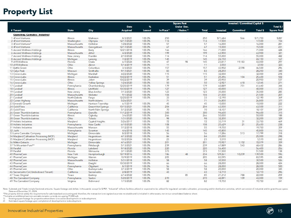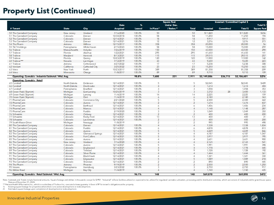 Innovative Industrial Properties 15 Square Feet Invested / Committed Capital $ Date % Under Dev. Total $ / #Tenant State City Acquired Leased In Place (1) / Redev. (2) Total Invested Committed Total $ Square Feet Operating: Cannabis - Industrial 14Front Ventures Illinois Matteson 8/3/2021 100.0% 250 - 250 $71,684 $66 $71,750 $287 24Front Ventures Washington Olympia 12/17/2020 100.0% 114 - 114 17,500 - 17,500 154 34Front Ventures* Massachusetts Holliston 1/28/2022 100.0% 57 - 57 16,000 - 16,000 281 44Front Ventures Massachusetts Georgetown 12/17/2020 100.0% 67 - 67 15,500 - 15,500 231 5Ascend Wellness Holdings Illinois Barry 12/21/2018 100.0% 166 - 166 71,000 - 71,000 428 6Ascend Wellness Holdings Massachusetts Athol 4/2/2020 100.0% 199 - 199 63,900 - 63,900 321 7Ascend Wellness Holdings New Jersey Franklin 2/10/2022 100.0% 114 - 114 55,000 - 55,000 482 8Ascend Wellness Holdings Michigan Lansing 7/2/2019 100.0% 145 - 145 24,150 - 24,150 167 9AYR Wellness Florida Ocala 6/7/2024 100.0% 47 98 145 23,817 19,183 43,000 297 10AYR Wellness Ohio Akron 5/14/2019 100.0% 11 - 11 3,550 - 3,550 323 11Battle Green Ohio Columbus 3/3/2023 100.0% 157 - 157 43,902 2,598 46,500 296 12Calyx Peak Missouri Smithville 9/17/2021 100.0% 83 - 83 28,250 - 28,250 340 13Cresco Labs Michigan Marshall 4/22/2020 100.0% 115 - 115 32,000 - 32,000 278 14Cresco Labs Illinois Kankakee 10/22/2019 100.0% 51 - 51 25,496 104 25,600 502 15Cresco Labs Illinois Joliet 10/22/2019 100.0% 39 - 39 20,950 - 20,950 537 16Cresco Labs Ohio Yellow Springs 1/24/2020 100.0% 50 - 50 12,927 618 13,545 271 17Curaleaf Pennsylvania Chambersburg 12/20/2019 100.0% 179 - 179 60,889 751 61,640 344 18Curaleaf Illinois Litchfield 10/30/2019 100.0% 127 - 127 40,000 - 40,000 315 19Curaleaf New Jersey Blue Anchor 7/13/2020 100.0% 123 - 123 35,000 - 35,000 285 20Curaleaf Massachusetts Webster 9/1/2022 100.0% 104 - 104 21,500 - 21,500 207 21Curaleaf North Dakota Fargo 12/20/2019 100.0% 33 - 33 12,190 - 12,190 369 22Curran Highway Massachusetts North Adams 5/26/2021 - 71 - 71 26,800 - 26,800 377 23Emerald Growth Michigan Harrison Township 6/7/2019 100.0% 45 - 45 10,000 - 10,000 222 24Gold Flora California Desert Hot Springs 10/15/2021 100.0% 204 - 204 63,500 - 63,500 311 25Gold Flora California North Palm Springs 5/12/2020 100.0% 70 - 70 18,107 - 18,107 259 26Green Thumb Industries Pennsylvania Danville 11/12/2019 100.0% 300 - 300 94,600 - 94,600 315 27Green Thumb Industries Illinois Oglesby 3/6/2020 100.0% 266 - 266 50,000 - 50,000 188 28Green Thumb Industries Ohio Toledo 1/31/2020 100.0% 98 - 98 32,200 - 32,200 329 29Holistic Industries Maryland Capitol Heights 5/26/2017 100.0% 72 - 72 33,719 31 33,750 469 30Holistic Industries Pennsylvania New Castle 6/10/2020 100.0% 108 - 108 25,629 21 25,650 238 31Holistic Industries Massachusetts Monson 7/12/2018 100.0% 55 - 55 19,750 - 19,750 359 32Jushi Pennsylvania Scranton 4/6/2018 100.0% 145 - 145 45,800 - 45,800 316 33Lume Cannabis Company Michigan Dimondale 8/2/2018 100.0% 56 - 56 17,286 513 17,799 318 34Maryland Cultivation Processing (MCP) Maryland Hagerstown 4/13/2022 100.0% 84 - 84 25,000 - 25,000 298 35Maryland Cultivation Processing (MCP) Maryland Hagerstown 10/2/2024 100.0% 23 - 23 5,570 - 5,570 242 36Mitten Extracts Michigan Dimondale 4/16/2021 100.0% 201 - 201 70,927 1,152 72,079 359 37Tri-Mountain Pure** Pennsylvania Pittsburgh 5/13/2021 100.0% 239 - 239 67,889 543 68,432 286 38Parallel Florida Lakeland 9/18/2020 100.0% 220 - 220 56,400 - 56,400 256 39Parallel Florida Wimauma 3/11/2020 100.0% 373 - 373 51,500 - 51,500 138 40PharmaCann New York Hamptonburgh 12/19/2016 100.0% 186 48 234 129,261 10,239 139,500 596 41PharmaCann Michigan Warren 10/9/2019 100.0% 205 - 205 83,595 - 83,595 408 42PharmaCann Massachusetts Holliston 5/31/2018 100.0% 58 - 58 30,500 - 30,500 526 43PharmaCann Illinois Dwight 10/30/2019 100.0% 66 - 66 28,000 - 28,000 424 44PharmaCann Pennsylvania Olyphant 8/7/2019 100.0% 56 - 56 28,000 - 28,000 500 45PharmaCann Ohio Buckeye Lake 3/13/2019 100.0% 58 - 58 20,000 - 20,000 345 46Sacramento CA (Undisclosed Tenant) California Sacramento 2/8/2019 100.0% 43 - 43 12,710 - 12,710 296 47Texas Original Texas Bastrop 6/14/2022 100.0% - 85 85 21,212 788 22,000 259 48The Cannabist Company Pennsylvania Saxton 5/20/2019 100.0% 270 - 270 42,891 109 43,000 159 49The Cannabist Company Virginia Richmond 1/15/2020 100.0% 82 - 82 19,750 - 19,750 241 Note : Subtotals and Totals include fractional amounts . Square footage and dollars in thousands except for $ /PSF . “Industrial” reflects facilities utilized or expected to be utilized for regulated cannabis cultivation, processing and/or distribution activities, which can consist of industrial and/or greenhouse space . Data as of December 31 , 2024 . * This property did not satisfy the requirements for sale - leaseback accounting and therefore, the transaction is recognized as a note receivable and is included in other assets, net on our consolidated balance sheet . **Includes an additional two non - cannabis tenants currently occupying 79 , 000 sqft . 1) Existing square footage for properties where there is no active development or redevelopment . 2) Estimated square footage upon completion of development or redevelopment . Property List