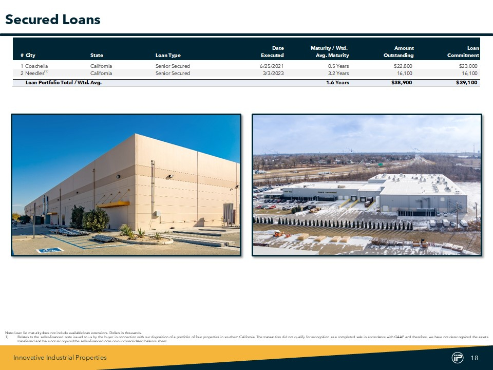 Innovative Industrial Properties 18 Date Maturity / Wtd. Amount Loan #City State Loan Type Executed Avg. Maturity Outstanding Commitment 1Coachella California Senior Secured 6/25/2021 0.5 Years $22,800 $23,000 2 Needles (1) California Senior Secured 3/3/2023 3.2 Years 16,100 16,100 Loan Portfolio Total / Wtd. Avg. 1.6 Years $38,900 $39,100 Secured Loans Note : Loan list maturity does not include available loan extensions . Dollars in thousands . 1) Relates to the seller - financed note issued to us by the buyer in connection with our disposition of a portfolio of four properties in southern California . The transaction did not qualify for recognition as a completed sale in accordance with GAAP and therefore, we have not derecognized the assets transferred and have not recognized the seller - financed note on our consolidated balance sheet .