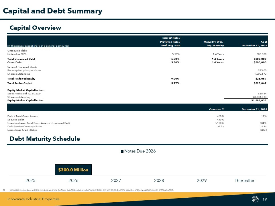Innovative Industrial Properties 19 Interest Rate / Preferred Rate / Maturity / Wtd. As of (In thousands, except share and per share amounts) Wtd. Avg. Rate Avg. Maturity December 31, 2024 Unsecured debt: Notes due 2026 5.50% 1.4 Years 300,000 Total Unsecured Debt 5.50% 1.4 Years $300,000 Gross Debt 5.50% 1.4 Years $300,000 Series A Preferred Stock: Redemption price per share $25.00 Shares outstanding 1,002,673 Total Preferred Equity 9.00% $25,067 Total Senior Capital 5.77% $325,067 Equity Market Capitalization: Stock Price as of 12/31/2024 $66.64 Shares outstanding 28,331,833 Equity Market Capitalization $1,888,033 Covenant (1) December 31, 2024 Debt / Total Gross Assets <60% 11% Secured Debt <40% - Unencumbered Total Gross Assets / Unsecured Debt >150% 884% Debt Service Coverage Ratio >1.5x 16.8x Egan Jones Credit Rating BBB+ Debt Maturity Schedule Capital and Debt Summary $300.0 Million 2025 2026 2027 2028 2029 Thereafter Notes Due 2026 Capital Overview 1) Calculated in accordance with the indenture governing the Notes due 2026 , included in the Current Report on Form 8 - K filed with the Securities and Exchange Commission on May 25 , 2021 .