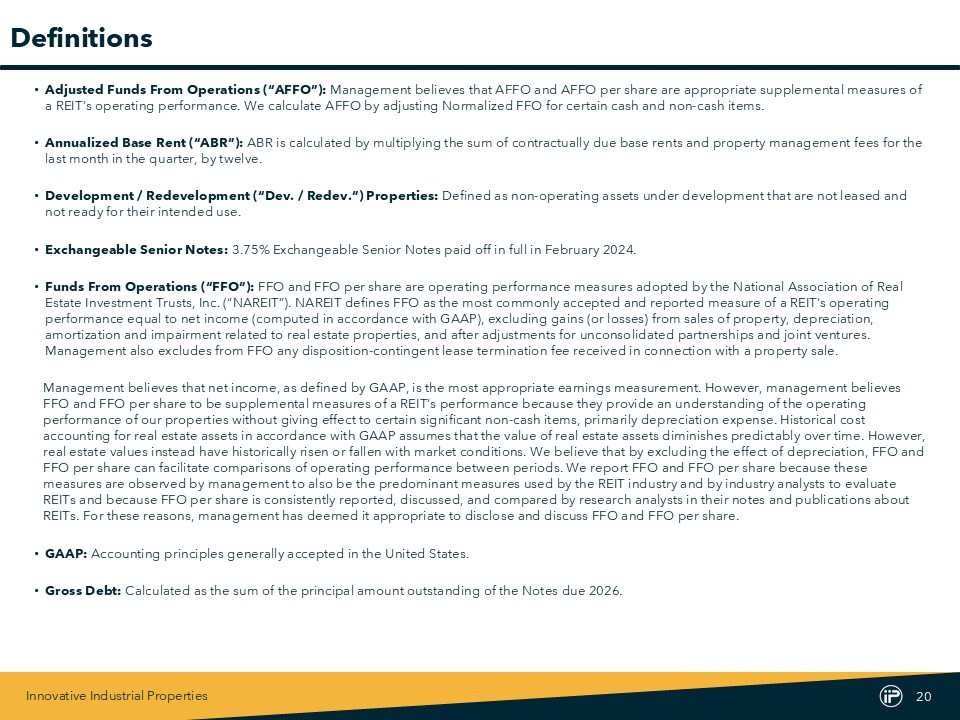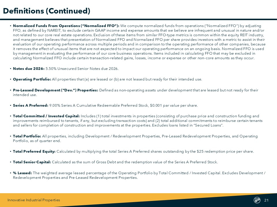 Innovative Industrial Properties 20 Definitions • Adjusted Funds From Operations (“AFFO”): Management believes that AFFO and AFFO per share are appropriate supplemental measures of a REIT’s operating performance. We calculate AFFO by adjusting Normalized FFO for certain cash and non - cash items. • Annualized Base Rent (“ABR”): ABR is calculated by multiplying the sum of contractually due base rents and property management fees for the last month in the quarter, by twelve. • Development / Redevelopment (“Dev. / Redev.”) Properties: Defined as non - operating assets under development that are not leased and not ready for their intended use. • Exchangeable Senior Notes: 3.75% E xchangeable Senior Notes paid off in full in February 2024. • Funds From Operations (“FFO”): FFO and FFO per share are operating performance measures adopted by the National Association of Real Estate Investment Trusts, Inc. (“NAREIT”). NAREIT defines FFO as the most commonly accepted and reported measure of a REIT’s ope rating performance equal to net income (computed in accordance with GAAP), excluding gains (or losses) from sales of property, depre cia tion, amortization and impairment related to real estate properties, and after adjustments for unconsolidated partnerships and join t v entures. Management also excludes from FFO any disposition - contingent lease termination fee received in connection with a property sale. Management believes that net income, as defined by GAAP, is the most appropriate earnings measurement. However, management be lie ves FFO and FFO per share to be supplemental measures of a REIT’s performance because they provide an understanding of the operat ing performance of our properties without giving effect to certain significant non - cash items, primarily depreciation expense. Histo rical cost accounting for real estate assets in accordance with GAAP assumes that the value of real estate assets diminishes predictably ov er time. However, real estate values instead have historically risen or fallen with market conditions. We believe that by excluding the effect of depreciation, FFO and FFO per share can facilitate comparisons of operating performance between periods. We report FFO and FFO per share because th ese measures are observed by management to also be the predominant measures used by the REIT industry and by industry analysts to ev aluate REITs and because FFO per share is consistently reported, discussed, and compared by research analysts in their notes and pub lic ations about REITs. For these reasons, management has deemed it appropriate to disclose and discuss FFO and FFO per share. • GAAP: Accounting principles generally accepted in the United States. • Gross Debt: Calculated as the sum of the principal amount outstanding of the Notes due 2026.