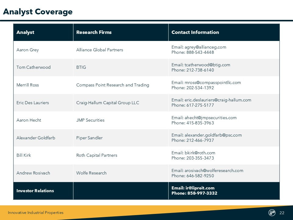 Innovative Industrial Properties 22 Analyst Coverage Contact Information Research Firms Analyst Email: agrey@allianceg.com Phone: 888 - 543 - 4448 Alliance Global Partners Aaron Grey Email: tcatherwood@btig.com Phone: 212 - 738 - 6140 BTIG Tom Catherwood Email: mross@compasspointllc.com Phone: 202 - 534 - 1392 Compass Point Research and Trading Merrill Ross Email: eric.deslauriers@craig - hallum.com Phone: 617 - 275 - 5177 Craig - Hallum Capital Group LLC Eric Des Lauriers Email: ahecht@jmpsecurities.com Phone: 415 - 835 - 3963 JMP Securities Aaron Hecht Email: alexander.goldfarb@psc.com Phone: 212 - 466 - 7937 Piper Sandler Alexander Goldfarb Email: bkirk@roth.com Phone: 203 - 355 - 3473 Roth Capital Partners Bill Kirk Email: arosivach@wolferesearch.com Phone: 646 - 582 - 9250 Wolfe Research Andrew Rosivach Email: ir@iipreit.com Phone: 858 - 997 - 3332 Investor Relations