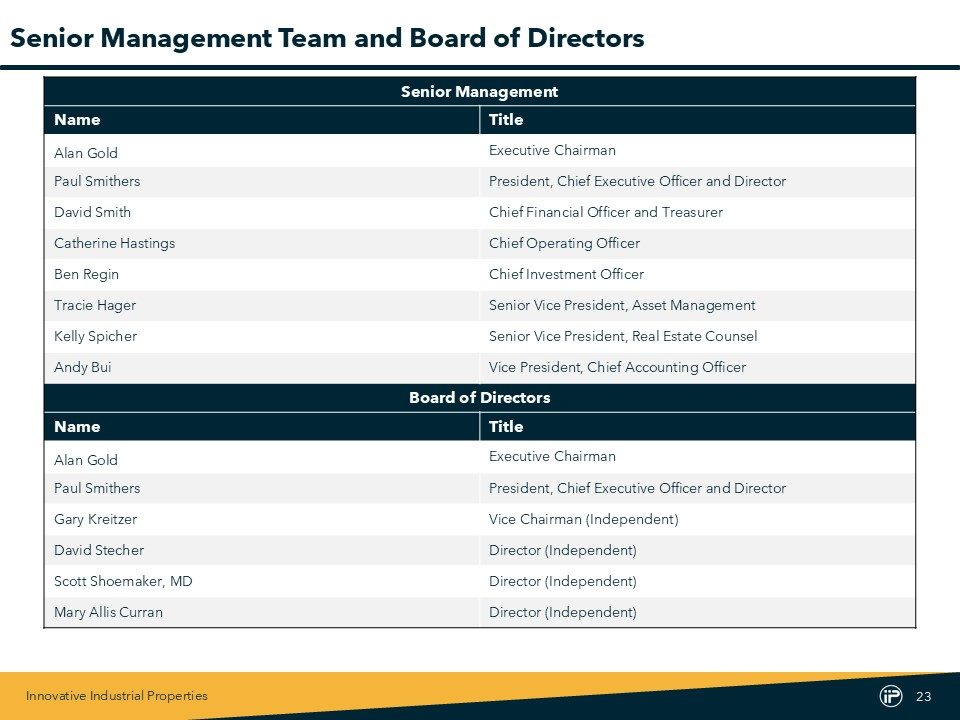 Innovative Industrial Properties 23 Senior Management Team and Board of Directors Senior Management Title Name Executive Chairman Alan Gold President, Chief Executive Officer and Director Paul Smithers Chief Financial Officer and Treasurer David Smith Chief Operating Officer Catherine Hastings Chief Investment Officer Ben Regin Senior Vice President, Asset Management Tracie Hager Senior Vice President, Real Estate Counsel Kelly Spicher Vice President, Chief Accounting Officer Andy Bui Board of Directors Title Name Executive Chairman Alan Gold President, Chief Executive Officer and Director Paul Smithers Vice Chairman (Independent) Gary Kreitzer Director (Independent) David Stecher Director (Independent) Scott Shoemaker, MD Director (Independent) Mary Allis Curran