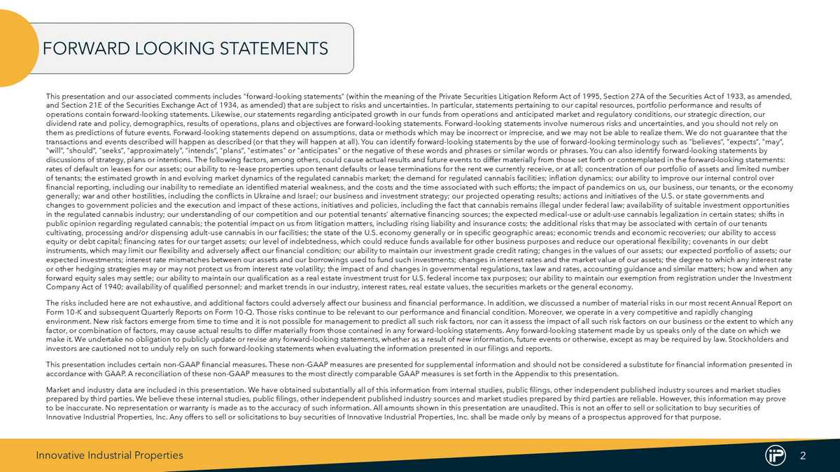 Innovative Industrial Properties 2 This presentation and our associated comments includes "forward - looking statements" (within the meaning of the Private Securitie s Litigation Reform Act of 1995, Section 27A of the Securities Act of 1933, as amended, and Section 21E of the Securities Exchange Act of 1934, as amended) that are subject to risks and uncertainties. In particular, statements pertaining to our capital resources, portfolio performance and results of operations contain forward - looking statements. Likewise, our statements regarding anticipated growth in our funds from operation s and anticipated market and regulatory conditions, our strategic direction, our dividend rate and policy, demographics, results of operations, plans and objectives are forward - looking statements. Forward - look ing statements involve numerous risks and uncertainties, and you should not rely on them as predictions of future events. Forward - looking statements depend on assumptions, data or methods which may be incorrect o r imprecise, and we may not be able to realize them. We do not guarantee that the transactions and events described will happen as described (or that they will happen at all). You can identify forward - looking s tatements by the use of forward - looking terminology such as "believes“, "expects“, "may“, "will“, "should“, "seeks“, "approximately“, "intends“, "plans“, "estimates" or "anticipates" or the negative of these words a nd phrases or similar words or phrases. You can also identify forward - looking statements by discussions of strategy, plans or intentions. The following factors, among others, could cause actual results and future even ts to differ materially from those set forth or contemplated in the forward - looking statements: rates of default on leases for our assets; our ability to re - lease properties upon tenant defaults or lease terminations for the rent we currently receive, or at all; concentration of our portfolio of assets and limited number of tenants; the estimated growth in and evolving market dynamics of the regulated cannabis market; the demand for regulated c ann abis facilities; inflation dynamics; our ability to improve our internal control over financial reporting, including our inability to remediate an identified material weakness, and the costs and the time associa ted with such efforts; the impact of pandemics on us, our business, our tenants, or the economy generally; war and other hostilities, including the conflicts in Ukraine and Israel; our business and investment strategy; ou r p rojected operating results; actions and initiatives of the U.S. or state governments and changes to government policies and the execution and impact of these actions, initiatives and policies, including the fact th at cannabis remains illegal under federal law; availability of suitable investment opportunities in the regulated cannabis industry; our understanding of our competition and our potential tenants’ alternative financing sou rce s; the expected medical - use or adult - use cannabis legalization in certain states; shifts in public opinion regarding regulated cannabis; the potential impact on us from litigation matters, including rising liability a nd insurance costs; the additional risks that may be associated with certain of our tenants cultivating, processing and/or dispensing adult - use cannabis in our facilities; the state of the U.S. economy generally or in sp ecific geographic areas; economic trends and economic recoveries; our ability to access equity or debt capital; financing rates for our target assets; our level of indebtedness, which could reduce funds available for other business purposes and reduce our operational flexibility; covenants in our debt instruments, which may limit our flexibility and adversely affect our financial condition; our ability to maintain our invest men t grade credit rating; changes in the values of our assets; our expected portfolio of assets; our expected investments; interest rate mismatches between our assets and our borrowings used to fund such investments; changes i n i nterest rates and the market value of our assets; the degree to which any interest rate or other hedging strategies may or may not protect us from interest rate volatility; the impact of and changes in governmenta l r egulations, tax law and rates, accounting guidance and similar matters; how and when any forward equity sales may settle; our ability to maintain our qualification as a real estate investment trust for U.S. federal in come tax purposes; our ability to maintain our exemption from registration under the Investment Company Act of 1940; availability of qualified personnel; and market trends in our industry, interest rates, real estate valu es, the securities markets or the general economy. The risks included here are not exhaustive, and additional factors could adversely affect our business and financial performa nce . In addition, we discussed a number of material risks in our most recent Annual Report on Form 10 - K and subsequent Quarterly Reports on Form 10 - Q. Those risks continue to be relevant to our performance and financial co ndition. Moreover, we operate in a very competitive and rapidly changing environment. New risk factors emerge from time to time and it is not possible for management to predict all such risk factors, nor can it assess the impact of all such risk factors o n our business or the extent to which any factor, or combination of factors, may cause actual results to differ materially from those contained in any forward - looking sta tements. Any forward - looking statement made by us speaks only of the date on which we make it. We undertake no obligation to publicly update or revise any forward - looking statements, whether as a result of new information, future events or otherwise, except as may be required by law. Stockholders and investors are cautioned not to unduly rely on such forward - 