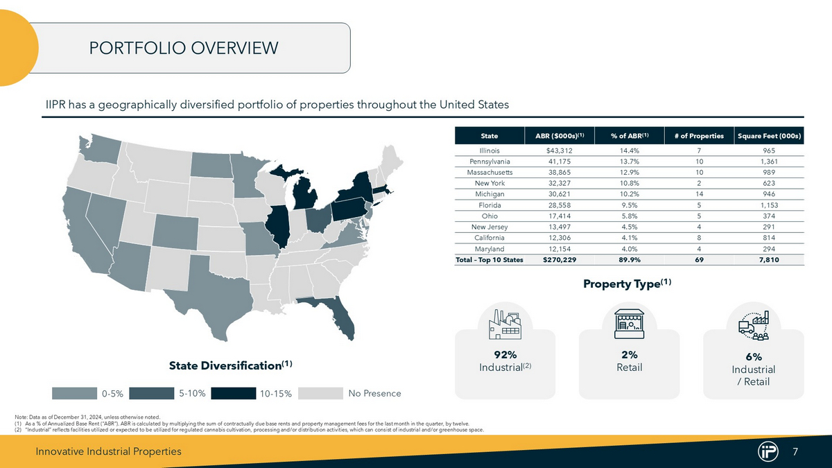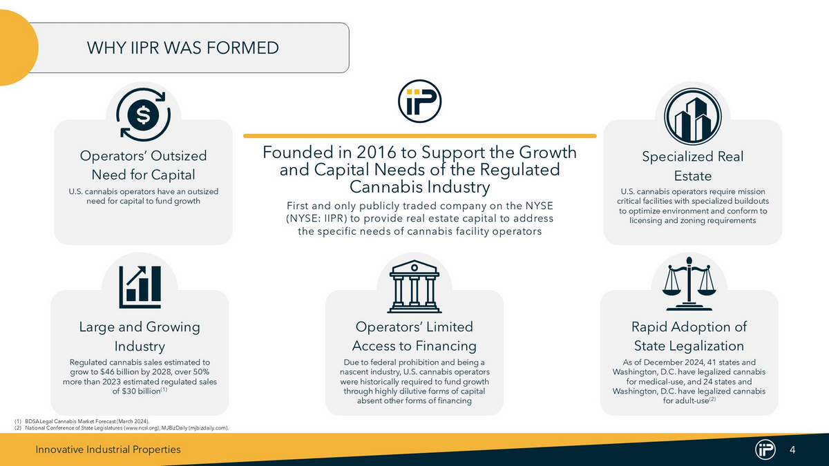 Innovative Industrial Properties 3 NNN cannabis REIT • Large diversified portfolio of $2.5B of cannabis real estate • Diversified across 19 states and 31 tenants (4) • Contractual, annual escalations provide built in cash flow growth History of providing value to shareholders • Increased dividend every year since inception through 2024 • One of the lowest leveraged publicly traded REITs • Demonstrated access to multiple capital markets IIPR provides direct investment exposure to cannabis with the stability of real estate • The only NYSE - listed cannabis REIT • High growth industry with an estimated 9% CAGR over next 5 years (5) • Exposure to numerous cannabis markets and tenants Seasoned management team with significant REIT experience • Our founder, Alan Gold, has a history of establishing real estate companies • Senior management team with long term public REIT experience Note : Data as of December 31 , 2024 , unless otherwise noted . (1) Total Committed / Invested Capital includes ( 1 ) total investments in properties (consisting of purchase price and improvements reimbursed to tenants, if any, but excluding transaction costs) and ( 2 ) total additional commitments to reimburse certain tenants for completion of construction and improvements at the properties . (2) Reflects annualized common stock dividend paid on January 15 , 2025 of $ 1 . 90 per share . (3) Weighted average lease length calculated by weighting the remaining lease term based on the base rent and management fees, after the expiration of applicable base rent phase - in periods for the Operating Portfolio . (4) Each “Tenant” represents the parent company of the tenant, for which the parent company has provided a corporate guaranty . A parent company may have multiple tenant subsidiaries across IIPR’s properties . Excludes non - cannabis tenants . (5) BDSA Legal Cannabis Market Forecast (March 2024 ) . IIPR AT A GLANCE $2.5B Total Committed / Invested Capital (1) 109 Properties 9 .0M Rentable Square Feet 19 U.S. States $7.60 Q4 2024 Annualized Dividend (2) $76.7M Q4 2024 Total Revenue 13.7 Years Weighted Average Lease Length (3) COMPANY SPOTLIGHT