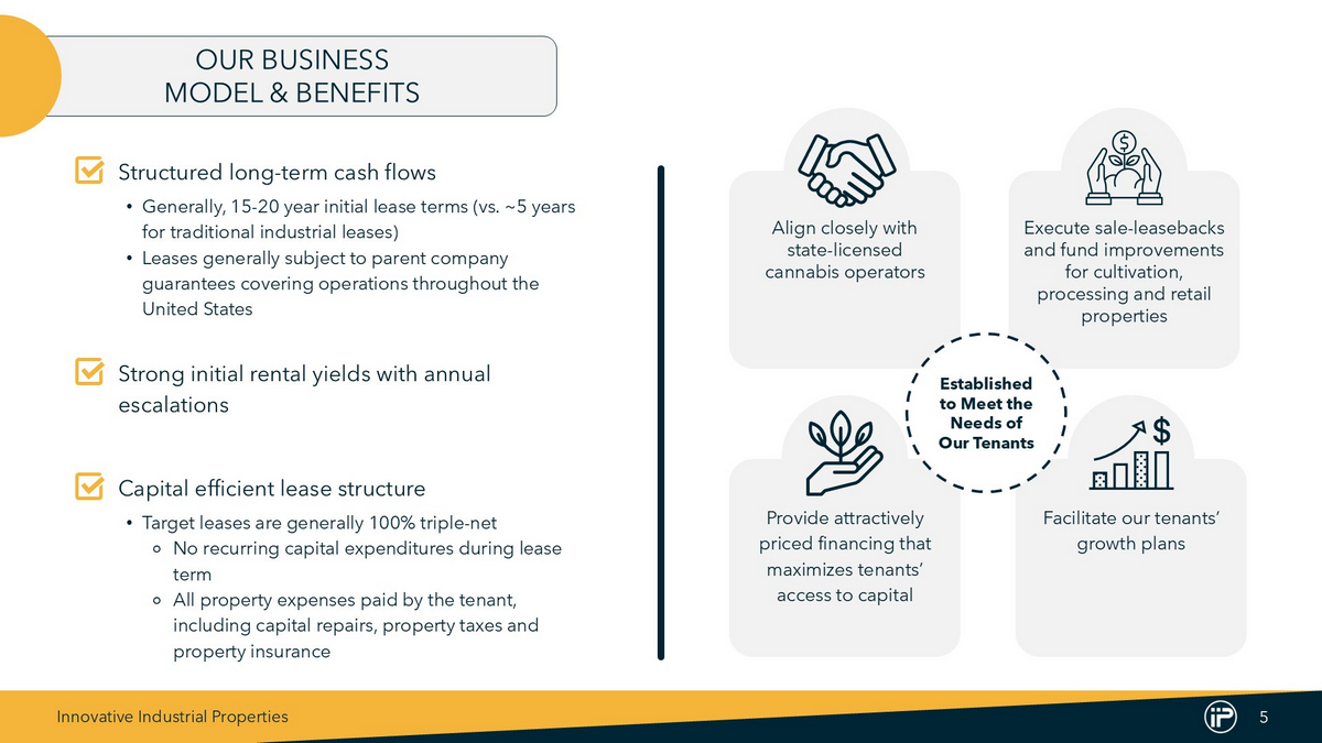 Innovative Industrial Properties 4 Founded in 2016 to Support the Growth and Capital Needs of the Regulated Cannabis Industry First and only publicly traded company on the NYSE (NYSE: IIPR) to provide real estate capital to address the specific needs of cannabis facility operators Specialized Real Estate U.S. cannabis operators require mission critical facilities with specialized buildouts to optimize environment and conform to licensing and zoning requirements Operators’ Outsized Need for Capital U.S. cannabis operators have an outsized need for capital to fund growth Rapid Adoption of State Legalization As of December 2024, 41 states and Washington, D.C. have legalized cannabis for medical - use, and 24 states and Washington, D.C. have legalized cannabis for adult - use (2) Large and Growing Industry Regulated cannabis sales estimated to grow to $46 billion by 2028, over 50% more than 2023 estimated regulated sales of $30 billion (1) Operators’ Limited Access to Financing Due to federal prohibition and being a nascent industry, U.S. cannabis operators were historically required to fund growth through highly dilutive forms of capital absent other forms of financing (1) BDSA Legal Cannabis Market Forecast (March 2024 ) . (2) National Conference of State Legislatures (www . ncsl . org), MJBizDaily (mjbizdaily . com) . WHY IIPR WAS FORMED