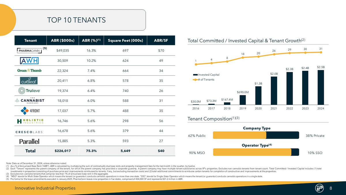 Innovative Industrial Properties 7 PORTFOLIO OVERVIEW IIPR has a geographically diversified portfolio of properties throughout the United States Note : Data as of December 31 , 2024 , unless otherwise noted . (1) As a % of Annualized Base Rent (“ABR”) . ABR is calculated by multiplying the sum of contractually due base rents and property management fees for the last month in the quarter, by twelve . (2) “Industrial” reflects facilities utilized or expected to be utilized for regulated cannabis cultivation, processing and/or distribution activities, which can consist of industrial and/or greenhouse space . Property Type (1) State Diversification (1) Square Feet (000s) # of Properties % of ABR (1) ABR ($000s) (1) State 965 7 14.4% $43,312 Illinois 1,361 10 13.7% 41,175 Pennsylvania 989 10 12.9% 38,865 Massachusetts 623 2 10.8% 32,327 New York 946 14 10.2% 30,621 Michigan 1,153 5 9.5% 28,558 Florida 374 5 5.8% 17,414 Ohio 291 4 4.5% 13,497 New Jersey 814 8 4.1% 12,306 California 294 4 4.0% 12,154 Maryland 7,810 69 89.9% $270,229 Total – Top 10 States 10 - 15% No Presence 0 - 5% 5 - 10% 2% Retail 92% Industrial (2) 6% Industrial / Retail