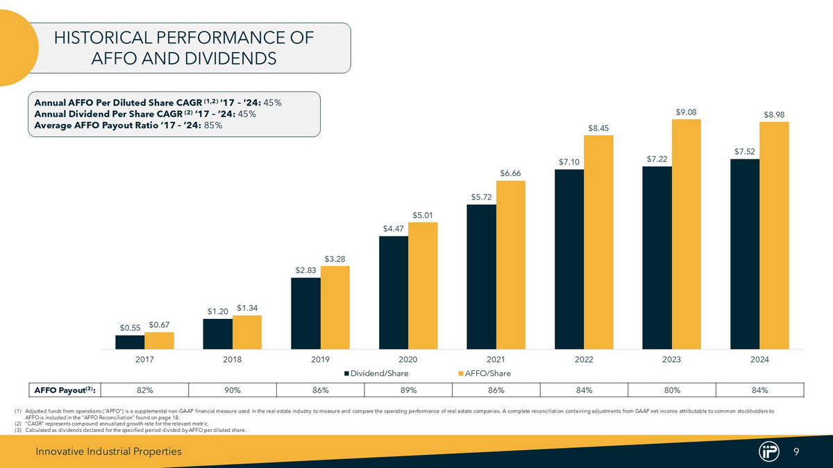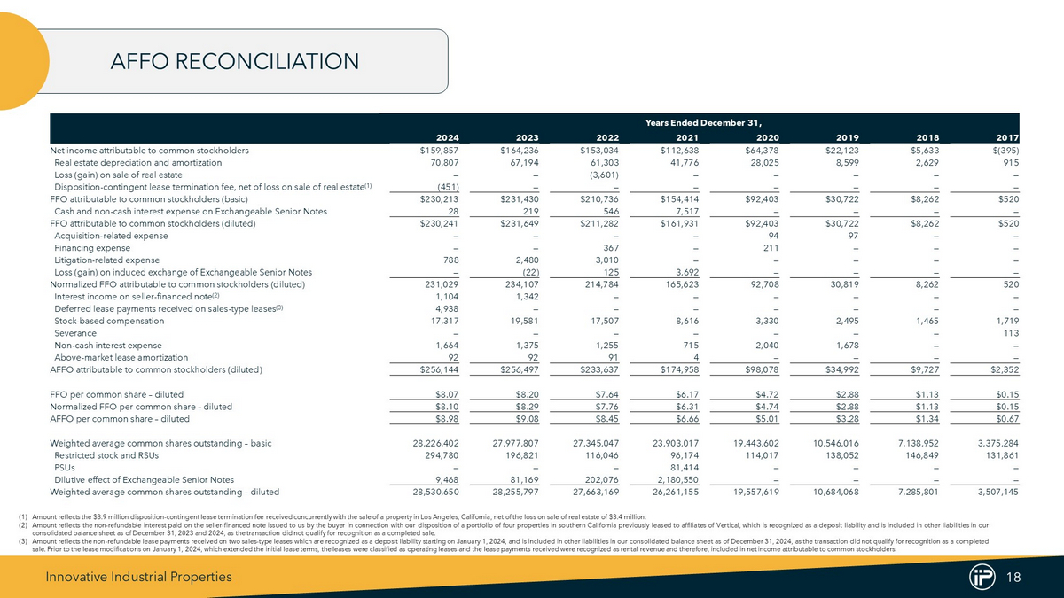Innovative Industrial Properties 18 AFFO RECONCILIATION Years Ended December 31, 2017 2018 2019 2020 2021 2022 2023 2024 $(395) $5,633 $22,123 $64,378 $112,638 $153,034 $164,236 $159,857 Net income attributable to common stockholders 915 2,629 8,599 28,025 41,776 61,303 67,194 70,807 Real estate depreciation and amortization — — — — — (3,601) — — Loss (gain) on sale of real estate — — — — — — — (451) Disposition - contingent lease termination fee, net of loss on sale of real estate (1) $520 $8,262 $30,722 $92,403 $154,414 $210,736 $231,430 $230,213 FFO attributable to common stockholders (basic) — — — — 7,517 546 219 28 Cash and non - cash interest expense on Exchangeable Senior Notes $520 $8,262 $30,722 $92,403 $161,931 $211,282 $231,649 $230,241 FFO attributable to common stockholders (diluted) — — 97 94 — — — — Acquisition - related expense — — — 211 — 367 — — Financing expense — — — — — 3,010 2,480 788 Litigation - related expense — — — — 3,692 125 (22) — Loss (gain) on induced exchange of Exchangeable Senior Notes 520 8,262 30,819 92,708 165,623 214,784 234,107 231,029 Normalized FFO attributable to common stockholders (diluted) — — — — — — 1,342 1,104 Interest income on seller - financed note (2) — — — — — — — 4,938 Deferred lease payments received on sales - type leases (3) 1,719 1,465 2,495 3,330 8,616 17,507 19,581 17,317 Stock - based compensation 113 — — — — — — — Severance — — 1,678 2,040 715 1,255 1,375 1,664 Non - cash interest expense — — — — 4 91 92 92 Above - market lease amortization $2,352 $9,727 $34,992 $98,078 $174,958 $233,637 $256,497 $256,144 AFFO attributable to common stockholders (diluted) $0.15 $1.13 $2.88 $4.72 $6.17 $7.64 $8.20 $8.07 FFO per common share – diluted $0.15 $1.13 $2.88 $4.74 $6.31 $7.76 $8.29 $8.10 Normalized FFO per common share – diluted $0.67 $1.34 $3.28 $5.01 $6.66 $8.45 $9.08 $8.98 AFFO per common share – diluted 3,375,284 7,138,952 10,546,016 19,443,602 23,903,017 27,345,047 27,977,807 28,226,402 Weighted average common shares outstanding – basic 131,861 146,849 138,052 114,017 96,174 116,046 196,821 294,780 Restricted stock and RSUs — — — — 81,414 — — — PSUs — — — — 2,180,550 202,076 81,169 9,468 Dilutive effect of Exchangeable Senior Notes 3,507,145 7,285,801 10,684,068 19,557,619 26,261,155 27,663,169 28,255,797 28,530,650 Weighted average common shares outstanding – diluted (1) Amount reflects the $ 3 . 9 million disposition - contingent lease termination fee received concurrently with the sale of a property in Los Angeles, California, net of the loss on sale of real estate of $ 3 . 4 million . (2) Amount reflects the non - refundable interest paid on the seller - financed note issued to us by the buyer in connection with our disposition of a portfolio of four properties in southern California previously leased to affiliates of Vertical, which is recognized as a deposit liability and is included in other liabilities in our consolidated balance sheet as of December 31 , 2023 and 2024 , as the transaction did not qualify for recognition as a completed sale . (3) Amount reflects the non - refundable lease payments received on two sales - type leases which are recognized as a deposit liability starting on January 1 , 2024 , and is included in other liabilities in our consolidated balance sheet as of December 31 , 2024 , as the transaction did not qualify for recognition as a completed sale . Prior to the lease modifications on January 1 , 2024 , which extended the initial lease terms, the leases were classified as operating leases and the lease payments received were recognized as rental revenue and therefore, included in net income attributable to common stockholders .
