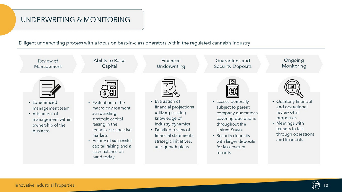 Innovative Industrial Properties 9 $0.55 $1.20 $2.83 $4.47 $5.72 $7.10 $7.22 $7.52 $0.67 $1.34 $3.28 $5.01 $6.66 $8.45 $9.08 $8.98 2017 2018 2019 2020 2021 2022 2023 2024 Dividend/Share AFFO/Share HISTORICAL PERFORMANCE OF AFFO AND DIVIDENDS 84% 80% 84% 86% 89% 86% 90% 82% AFFO Payout (3) : Annual AFFO Per Diluted Share CAGR (1,2) ‘17 – ’24: 45% Annual Dividend Per Share CAGR (2) ‘17 – ’24: 45% Average AFFO Payout Ratio ‘17 – ’24: 85% (1) Adjusted funds from operations (“AFFO”) is a supplemental non - GAAP financial measure used in the real estate industry to measure and compare the operating performance of real estate companies . A complete reconciliation containing adjustments from GAAP net income attributable to common stockholders to AFFO is included in the “AFFO Reconciliation” found on page 18 . (2) "CAGR" represents compound annualized growth rate for the relevant metric . (3) Calculated as dividends declared for the specified period divided by AFFO per diluted share .