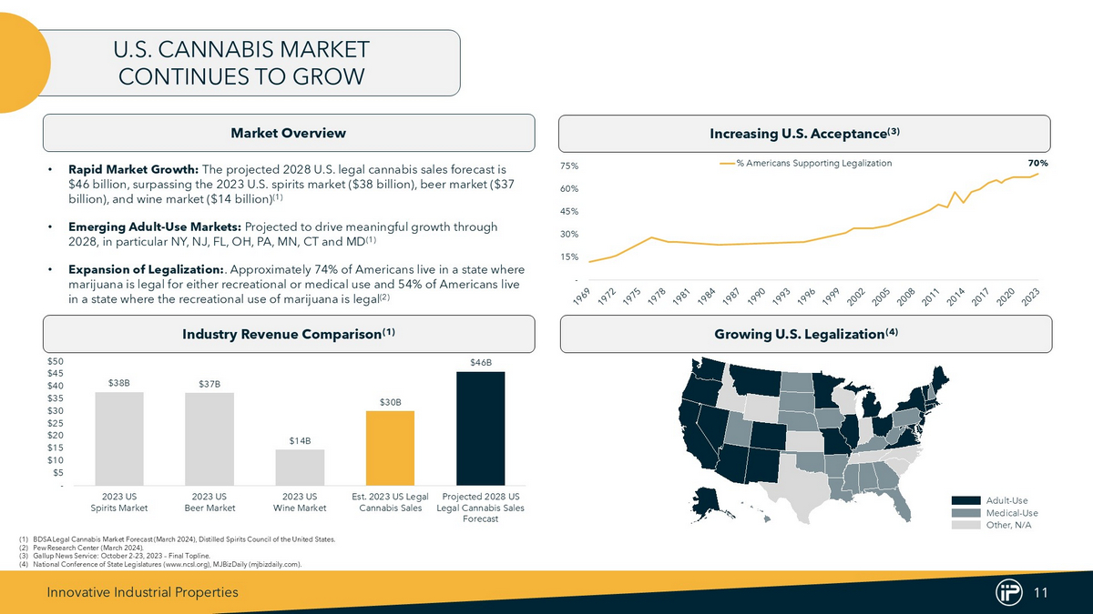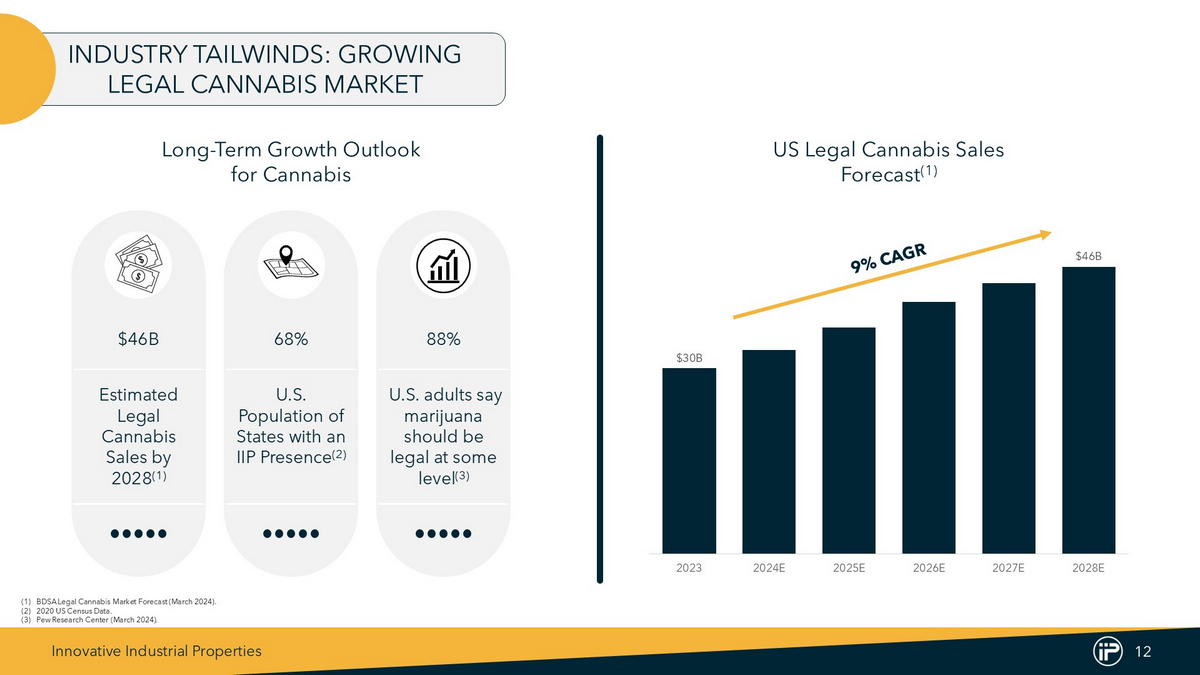 Innovative Industrial Properties 11 © GeoNames, Microsoft, TomTom Powered by Bing Market Overview U.S. CANNABIS MARKET CONTINUES TO GROW Increasing U.S. Acceptance (3) Industry Revenue Comparison (1) Growing U.S. Legalization (4) (1) BDSA Legal Cannabis Market Forecast (March 2024 ), Distilled Spirits Council of the United States . (2) Pew Research Center (March 2024 ) . (3) Gallup News Service : October 2 - 23 , 2023 – Final Topline . (4) National Conference of State Legislatures (www . ncsl . org), MJBizDaily (mjbizdaily . com) . Other, N/A Adult - Use Medical - Use 70% - 15% 30% 45% 60% 75% % Americans Supporting Legalization $38B $37B $14B $30B $46B - $5 $10 $15 $20 $25 $30 $35 $40 $45 $50 2023 US Spirits Market 2023 US Beer Market 2023 US Wine Market Est. 2023 US Legal Cannabis Sales Projected 2028 US Legal Cannabis Sales Forecast • Rapid Market Growth: The projected 2028 U.S. legal cannabis sales forecast is $46 billion, surpassing the 2023 U.S. spirits market ($38 billion), beer market ($37 billion), and wine market ($14 billion) (1) • Emerging Adult - Use Markets: Projected to drive meaningful growth through 2028, in particular NY, NJ, FL, OH, PA, MN, CT and MD (1) • Expansion of Legalization: . Approximately 74% of Americans live in a state where marijuana is legal for either recreational or medical use and 54% of Americans live in a state where the recreational use of marijuana is legal (2)