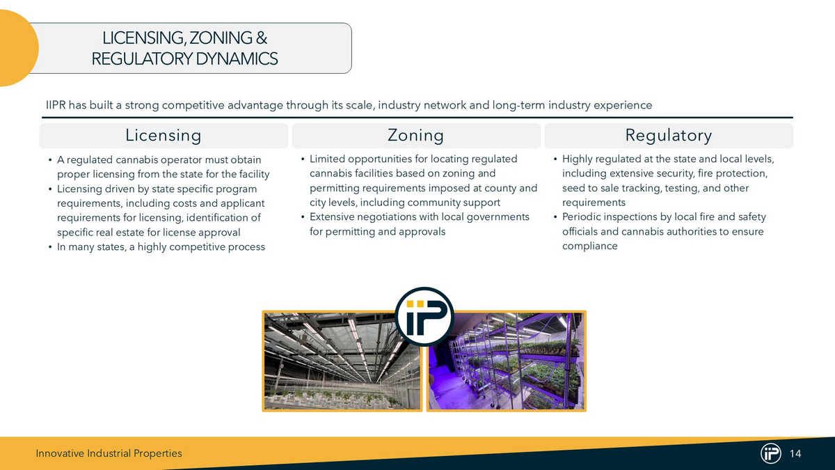 Innovative Industrial Properties 13 Institutions (by type) Providing Banking Services to MRBs (2) Institutional Adoption Continues Percentage of FDIC Banks that Offer Services to MRBs (1) INCREASED BANKING SERVICES FOR CANNABIS INDUSTRY Note : “MRB” refers to Marijuana Related Business, businesses that “manufacture,” “distribute” or “dispense” marijuana . (1) Treasury Department, FDIC data . (2) Treasury Department . - 2% 4% 6% 8% 10% 12% 2014 2015 2016 2017 2018 2019 2020 2021 2022 2023 515 173 143 0 100 200 300 400 500 600 1Q 2014 3Q 2014 1Q 2015 3Q 2015 1Q 2016 3Q 2016 1Q 2017 3Q 2017 1Q 2018 3Q 2018 1Q 2019 3Q 2019 1Q 2020 3Q 2020 1Q 2021 3Q 2021 1Q 2022 3Q 2022 1Q 2023 3Q 2023 1Q 2024 Banks Credit Unions Non-Depository • Increasing trend in FDIC banks offering services to marijuana - related business (“MRBs”) (from 2014 to 2023) reaching an all - time high of ~12% of the total number of banks in 2023 • Steady growth in the number of depository institutions supporting MRBs • ~800 banks, credit unions and other institutions providing services to marijuana - related businesses