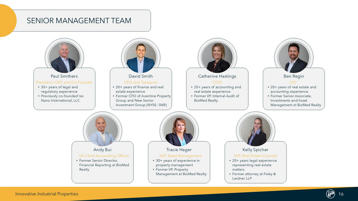Innovative Industrial Properties 15 Alan Gold Executive Chairman & Co - Founder Co - founder of BioMed Realty Trust (formerly NYSE: BMR); served as Chairman and CEO from inception of its predecessor in 1998 through BMR’s sale in 2016 • Owner and operator of high - quality life science real estate • Previously publicly traded investment grade REIT Co - founded Alexandria Real Estate Equities (NYSE: ARE) in 1994 and served as President and a director until 1998 • Invests in office buildings and laboratories leased to life science and technology companies Co - founder of IQHQ, Inc.; served as Executive Chairman from December 2018 until December 2024 • Privately - held life science real estate company with properties in both the U.S. and U.K. EXECUTIVE CHAIRMAN & CO - FOUNDER Alan Gold has experience founding and leading real estate companies focused on nuanced, regulated industries.