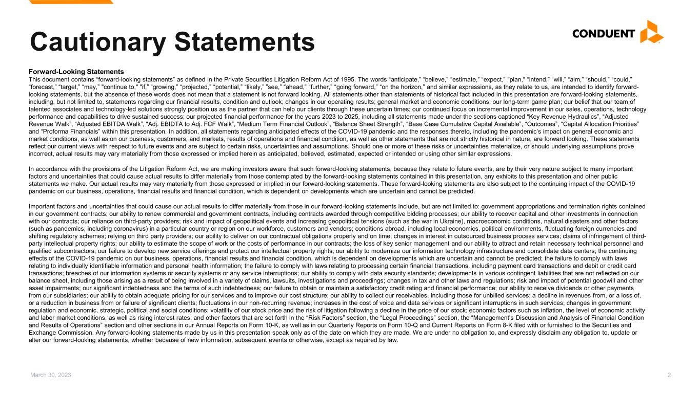 March 30, 2023 2 Cautionary Statements Forward-Looking Statements This document contains “forward-looking statements” as defined in the Private Securities Litigation Reform Act of 1995. The words “anticipate,” “believe,” “estimate,” “expect,” "plan," “intend,” “will,” “aim,” “should,” “could,” “forecast,” “target,” “may,” "continue to," "if,” “growing,” “projected,” “potential,” “likely,” ”see,” “ahead,” “further,” “going forward,” “on the horizon,” and similar expressions, as they relate to us, are intended to identify forward- looking statements, but the absence of these words does not mean that a statement is not forward looking. All statements other than statements of historical fact included in this presentation are forward-looking statements, including, but not limited to, statements regarding our financial results, condition and outlook; changes in our operating results; general market and economic conditions; our long-term game plan; our belief that our team of talented associates and technology-led solutions strongly position us as the partner that can help our clients through these uncertain times; our continued focus on incremental improvement in our sales, operations, technology performance and capabilities to drive sustained success; our projected financial performance for the years 2023 to 2025, including all statements made under the sections captioned “Key Revenue Hydraulics”, “Adjusted Revenue Walk”, “Adjusted EBITDA Walk”, “Adj. EBIDTA to Adj. FCF Walk”, “Medium Term Financial Outlook”, “Balance Sheet Strength”, “Base Case Cumulative Capital Available”, “Outcomes”, “Capital Allocation Priorities” and “Proforma Financials” within this presentation. In addition, all statements regarding anticipated effects of the COVID-19 pandemic and the responses thereto, including the pandemic’s impact on general economic and market conditions, as well as on our business, customers, and markets, results of operations and financial condition, as well as other statements that are not strictly historical in nature, are forward looking. These statements reflect our current views with respect to future events and are subject to certain risks, uncertainties and assumptions. Should one or more of these risks or uncertainties materialize, or should underlying assumptions prove incorrect, actual results may vary materially from those expressed or implied herein as anticipated, believed, estimated, expected or intended or using other similar expressions. In accordance with the provisions of the Litigation Reform Act, we are making investors aware that such forward-looking statements, because they relate to future events, are by their very nature subject to many important factors and uncertainties that could cause actual results to differ materially from those contemplated by the forward-looking statements contained in this presentation, any exhibits to this presentation and other public statements we make. Our actual results may vary materially from those expressed or implied in our forward-looking statements. These forward-looking statements are also subject to the continuing impact of the COVID-19 pandemic on our business, operations, financial results and financial condition, which is dependent on developments which are uncertain and cannot be predicted. Important factors and uncertainties that could cause our actual results to differ materially from those in our forward-looking statements include, but are not limited to: government appropriations and termination rights contained in our government contracts; our ability to renew commercial and government contracts, including contracts awarded through competitive bidding processes; our ability to recover capital and other investments in connection with our contracts; our reliance on third-party providers; risk and impact of geopolitical events and increasing geopolitical tensions (such as the war in Ukraine), macroeconomic conditions, natural disasters and other factors (such as pandemics, including coronavirus) in a particular country or region on our workforce, customers and vendors; conditions abroad, including local economics, political environments, fluctuating foreign currencies and shifting regulatory schemes; relying on third party providers; our ability to deliver on our contractual obligations properly and on time; changes in interest in outsourced business process services; claims of infringement of third- party intellectual property rights; our ability to estimate the scope of work or the costs of performance in our contracts; the loss of key senior management and our ability to attract and retain necessary technical personnel and qualified subcontractors; our failure to develop new service offerings and protect our intellectual property rights; our ability to modernize our information technology infrastructure and consolidate data centers; the continuing effects of the COVID-19 pandemic on our business, operations, financial results and financial condition, which is dependent on developments which are uncertain and cannot be predicted; the failure to comply with laws relating to individually identifiable information and personal health information; the failure to comply with laws relating to processing certain financial transactions, including payment card transactions and debit or credit card transactions; breaches of our information systems or security systems or any service interruptions; our ability to comply with data security standards; developments in various contingent liabilities that are not reflected on our balance sheet, including those arising as a result of being involved in a variety of claims, lawsuits, investigations and proceedings; changes in tax and other laws and regulations; risk and impact of potential goodwill and other asset impairments; our significant indebtedness and the te