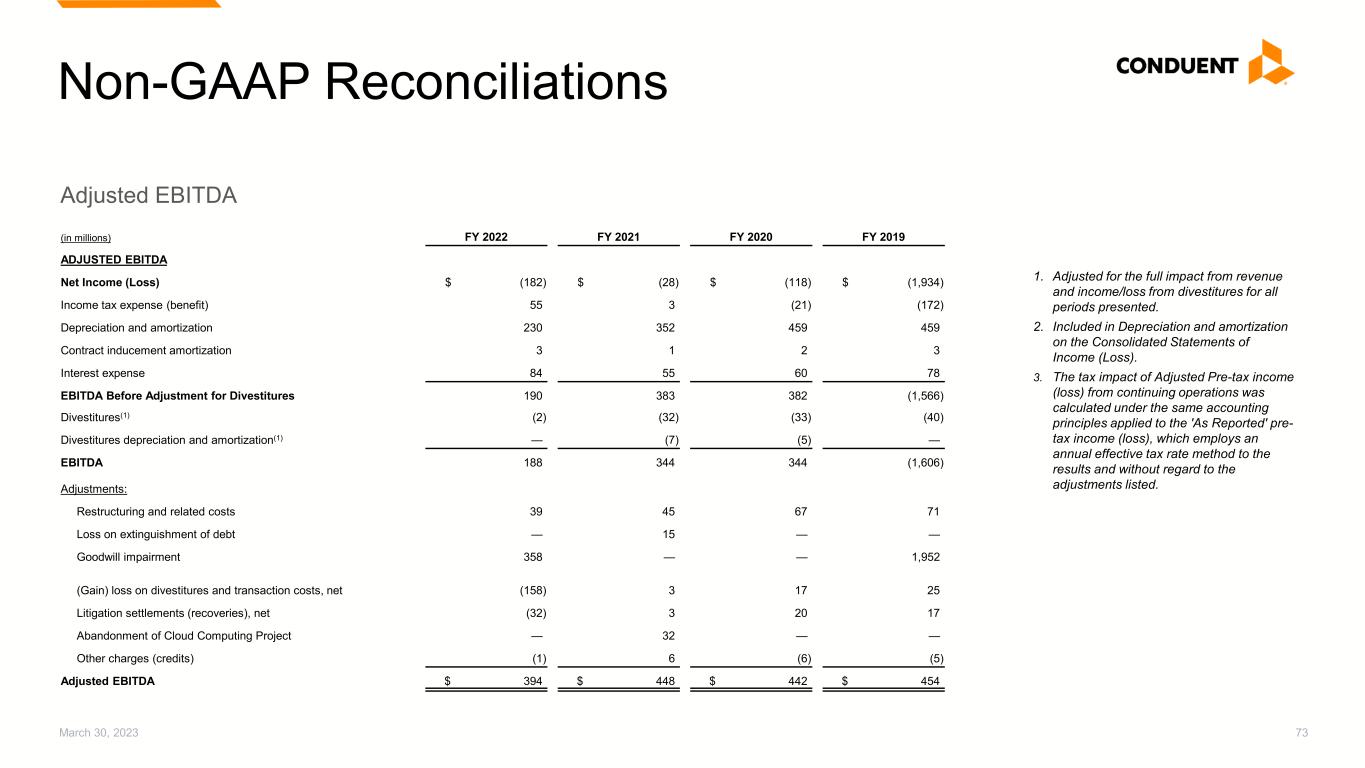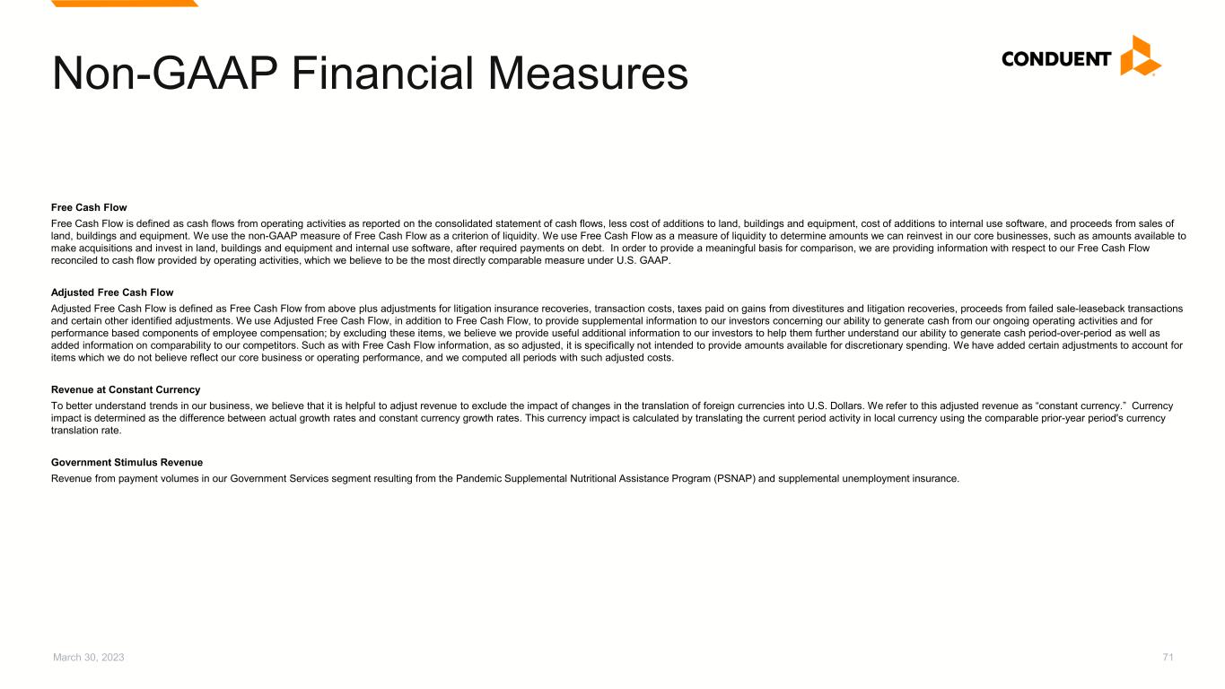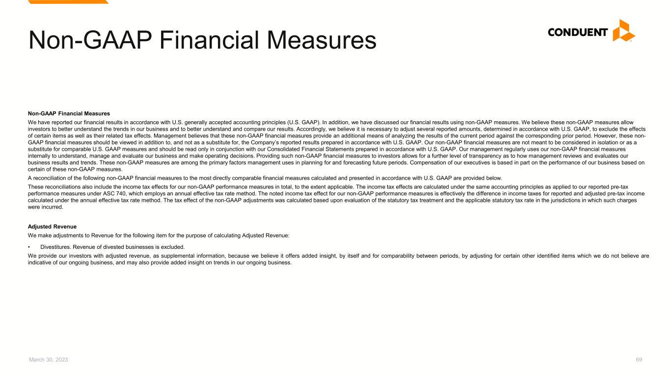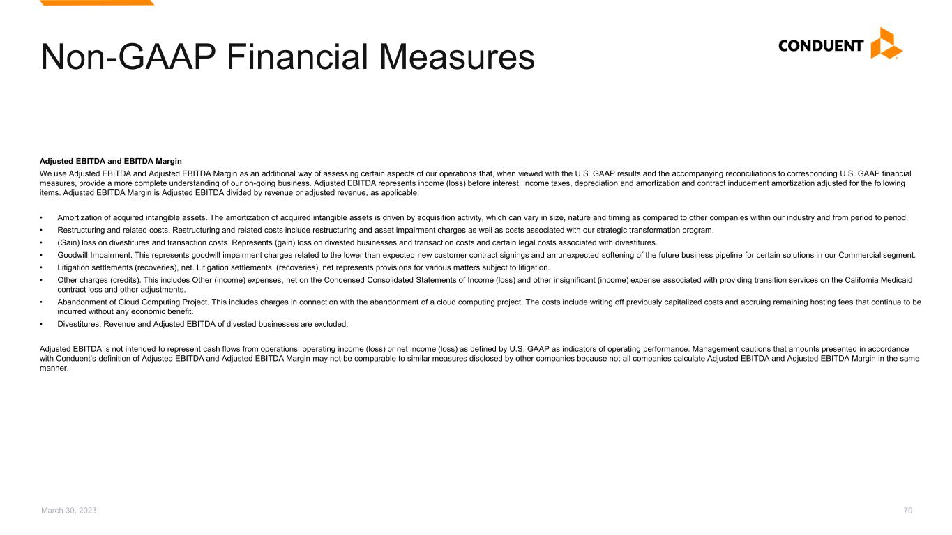 70 Adjusted EBITDA and EBITDA Margin We use Adjusted EBITDA and Adjusted EBITDA Margin as an additional way of assessing certain aspects of our operations that, when viewed with the U.S. GAAP results and the accompanying reconciliations to corresponding U.S. GAAP financial measures, provide a more complete understanding of our on-going business. Adjusted EBITDA represents income (loss) before interest, income taxes, depreciation and amortization and contract inducement amortization adjusted for the following items. Adjusted EBITDA Margin is Adjusted EBITDA divided by revenue or adjusted revenue, as applicable: • Amortization of acquired intangible assets. The amortization of acquired intangible assets is driven by acquisition activity, which can vary in size, nature and timing as compared to other companies within our industry and from period to period. • Restructuring and related costs. Restructuring and related costs include restructuring and asset impairment charges as well as costs associated with our strategic transformation program. • (Gain) loss on divestitures and transaction costs. Represents (gain) loss on divested businesses and transaction costs and certain legal costs associated with divestitures. • Goodwill Impairment. This represents goodwill impairment charges related to the lower than expected new customer contract signings and an unexpected softening of the future business pipeline for certain solutions in our Commercial segment. • Litigation settlements (recoveries), net. Litigation settlements (recoveries), net represents provisions for various matters subject to litigation. • Other charges (credits). This includes Other (income) expenses, net on the Condensed Consolidated Statements of Income (loss) and other insignificant (income) expense associated with providing transition services on the California Medicaid contract loss and other adjustments. • Abandonment of Cloud Computing Project. This includes charges in connection with the abandonment of a cloud computing project. The costs include writing off previously capitalized costs and accruing remaining hosting fees that continue to be incurred without any economic benefit. • Divestitures. Revenue and Adjusted EBITDA of divested businesses are excluded. Adjusted EBITDA is not intended to represent cash flows from operations, operating income (loss) or net income (loss) as defined by U.S. GAAP as indicators of operating performance. Management cautions that amounts presented in accordance with Conduent’s definition of Adjusted EBITDA and Adjusted EBITDA Margin may not be comparable to similar measures disclosed by other companies because not all companies calculate Adjusted EBITDA and Adjusted EBITDA Margin in the same manner. Non-GAAP Financial Measures March 30, 2023