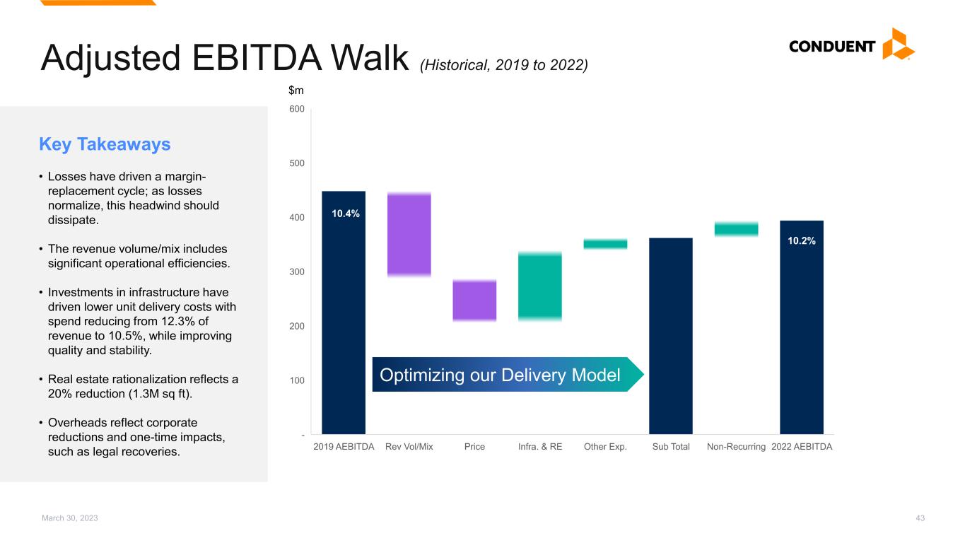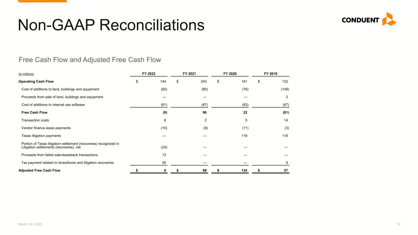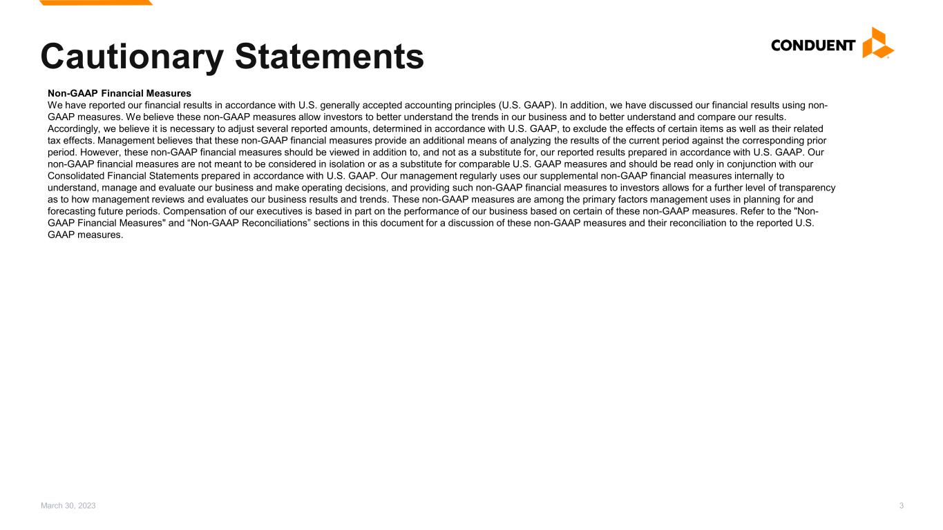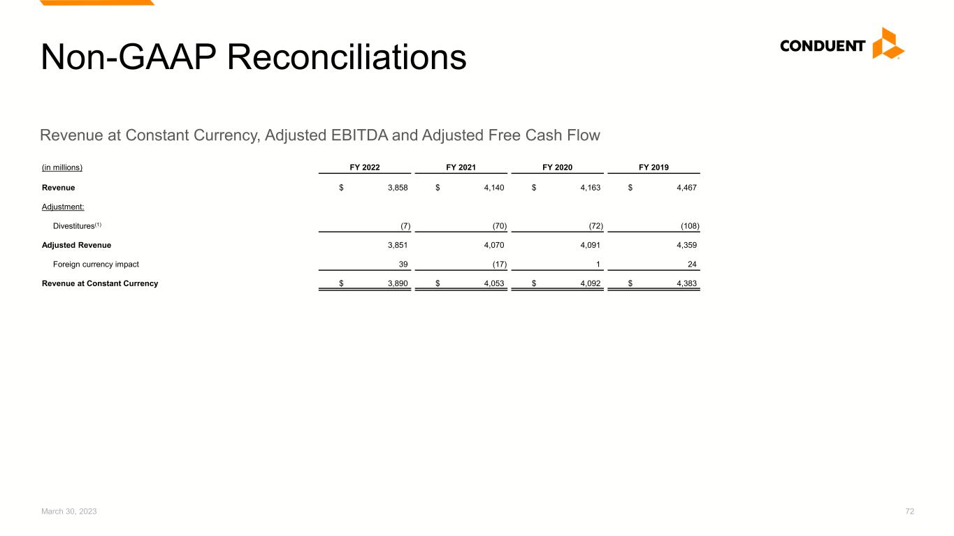 70 Adjusted EBITDA and EBITDA Margin We use Adjusted EBITDA and Adjusted EBITDA Margin as an additional way of assessing certain aspects of our operations that, when viewed with the U.S. GAAP results and the accompanying reconciliations to corresponding U.S. GAAP financial measures, provide a more complete understanding of our on-going business. Adjusted EBITDA represents income (loss) before interest, income taxes, depreciation and amortization and contract inducement amortization adjusted for the following items. Adjusted EBITDA Margin is Adjusted EBITDA divided by revenue or adjusted revenue, as applicable: • Amortization of acquired intangible assets. The amortization of acquired intangible assets is driven by acquisition activity, which can vary in size, nature and timing as compared to other companies within our industry and from period to period. • Restructuring and related costs. Restructuring and related costs include restructuring and asset impairment charges as well as costs associated with our strategic transformation program. • (Gain) loss on divestitures and transaction costs. Represents (gain) loss on divested businesses and transaction costs and certain legal costs associated with divestitures. • Goodwill Impairment. This represents goodwill impairment charges related to the lower than expected new customer contract signings and an unexpected softening of the future business pipeline for certain solutions in our Commercial segment. • Litigation settlements (recoveries), net. Litigation settlements (recoveries), net represents provisions for various matters subject to litigation. • Other charges (credits). This includes Other (income) expenses, net on the Condensed Consolidated Statements of Income (loss) and other insignificant (income) expense associated with providing transition services on the California Medicaid contract loss and other adjustments. • Abandonment of Cloud Computing Project. This includes charges in connection with the abandonment of a cloud computing project. The costs include writing off previously capitalized costs and accruing remaining hosting fees that continue to be incurred without any economic benefit. • Divestitures. Revenue and Adjusted EBITDA of divested businesses are excluded. Adjusted EBITDA is not intended to represent cash flows from operations, operating income (loss) or net income (loss) as defined by U.S. GAAP as indicators of operating performance. Management cautions that amounts presented in accordance with Conduent’s definition of Adjusted EBITDA and Adjusted EBITDA Margin may not be comparable to similar measures disclosed by other companies because not all companies calculate Adjusted EBITDA and Adjusted EBITDA Margin in the same manner. Non-GAAP Financial Measures March 30, 2023
