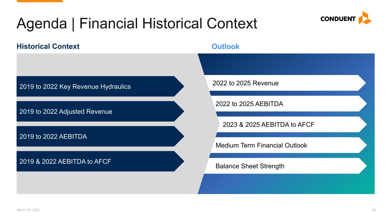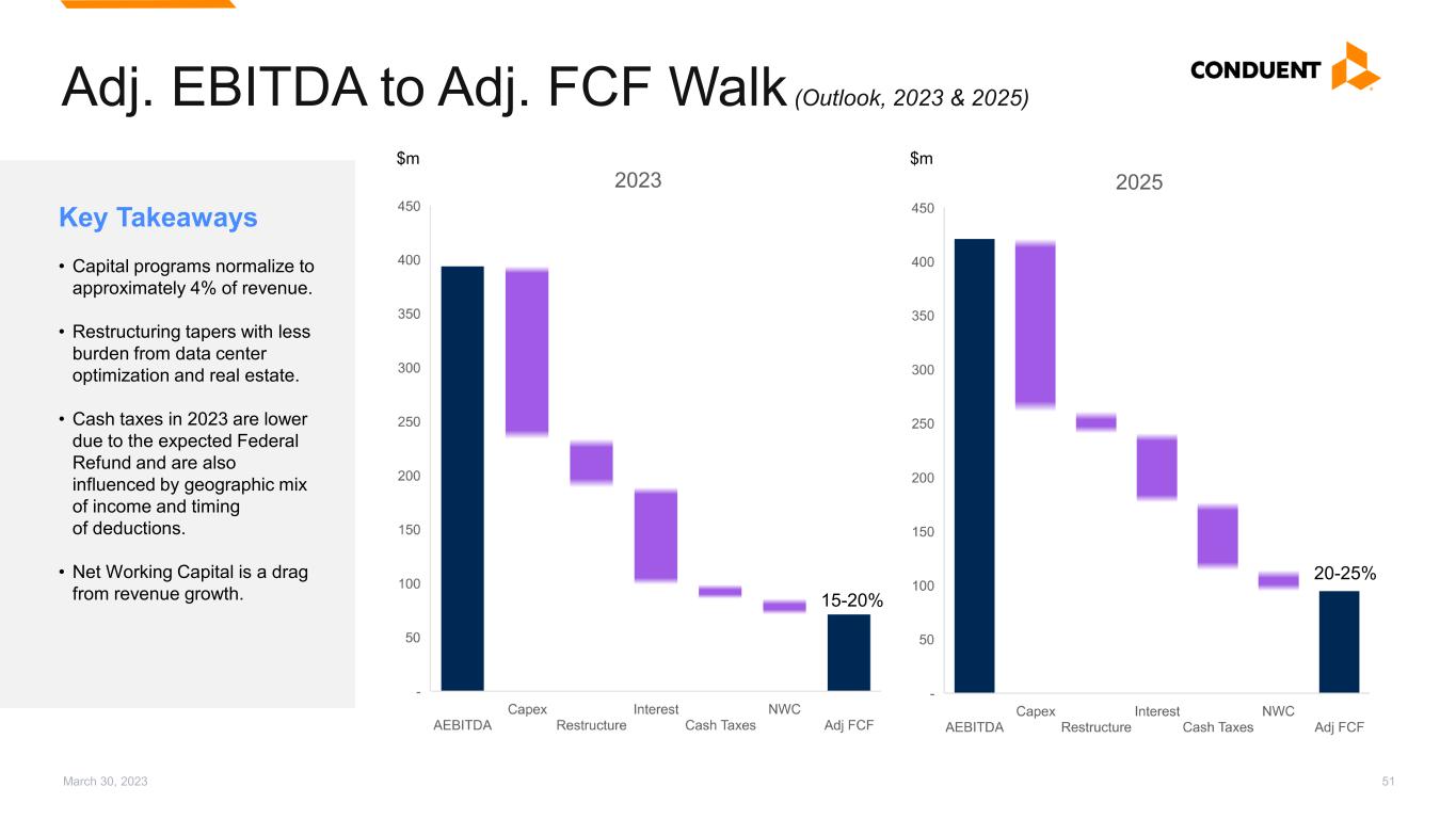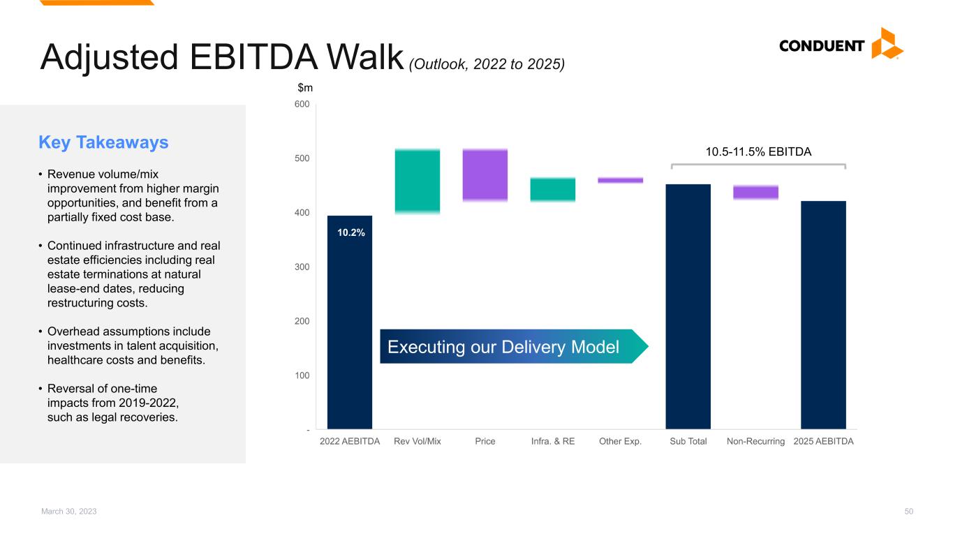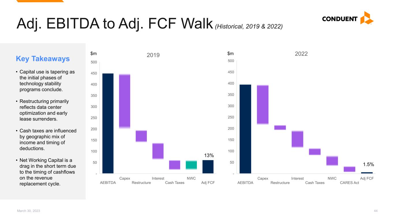 70 Adjusted EBITDA and EBITDA Margin We use Adjusted EBITDA and Adjusted EBITDA Margin as an additional way of assessing certain aspects of our operations that, when viewed with the U.S. GAAP results and the accompanying reconciliations to corresponding U.S. GAAP financial measures, provide a more complete understanding of our on-going business. Adjusted EBITDA represents income (loss) before interest, income taxes, depreciation and amortization and contract inducement amortization adjusted for the following items. Adjusted EBITDA Margin is Adjusted EBITDA divided by revenue or adjusted revenue, as applicable: • Amortization of acquired intangible assets. The amortization of acquired intangible assets is driven by acquisition activity, which can vary in size, nature and timing as compared to other companies within our industry and from period to period. • Restructuring and related costs. Restructuring and related costs include restructuring and asset impairment charges as well as costs associated with our strategic transformation program. • (Gain) loss on divestitures and transaction costs. Represents (gain) loss on divested businesses and transaction costs and certain legal costs associated with divestitures. • Goodwill Impairment. This represents goodwill impairment charges related to the lower than expected new customer contract signings and an unexpected softening of the future business pipeline for certain solutions in our Commercial segment. • Litigation settlements (recoveries), net. Litigation settlements (recoveries), net represents provisions for various matters subject to litigation. • Other charges (credits). This includes Other (income) expenses, net on the Condensed Consolidated Statements of Income (loss) and other insignificant (income) expense associated with providing transition services on the California Medicaid contract loss and other adjustments. • Abandonment of Cloud Computing Project. This includes charges in connection with the abandonment of a cloud computing project. The costs include writing off previously capitalized costs and accruing remaining hosting fees that continue to be incurred without any economic benefit. • Divestitures. Revenue and Adjusted EBITDA of divested businesses are excluded. Adjusted EBITDA is not intended to represent cash flows from operations, operating income (loss) or net income (loss) as defined by U.S. GAAP as indicators of operating performance. Management cautions that amounts presented in accordance with Conduent’s definition of Adjusted EBITDA and Adjusted EBITDA Margin may not be comparable to similar measures disclosed by other companies because not all companies calculate Adjusted EBITDA and Adjusted EBITDA Margin in the same manner. Non-GAAP Financial Measures March 30, 2023