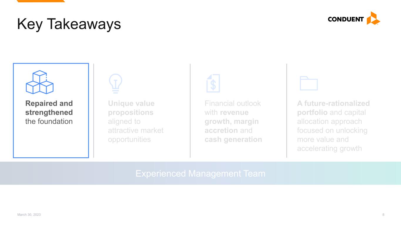 7 Our Goal: Driving Shareholder Value Technology-led Capabilities Strong Talent and Culture Proven Outcomes for Marquee Clients Large and Favorable Market Opportunities Improved Margin Expanded Free Cash Flow Revenue Growth Shareholder Value Deployable Capital Strengths Outcomes March 30, 2023
