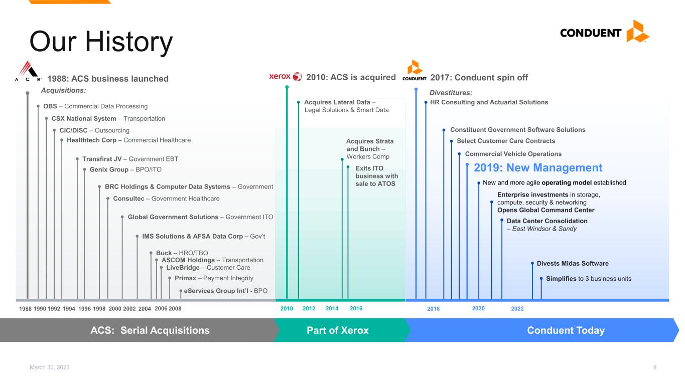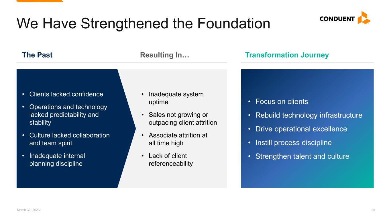 9 Our History 2010 2012 2014 2016 2018 2020 2022 ACS: Serial Acquisitions Part of Xerox Conduent Today 1988: ACS business launched 2010: ACS is acquired Acquires Lateral Data – Legal Solutions & Smart Data Acquires Strata and Bunch – Workers Comp Exits ITO business with sale to ATOS 2017: Conduent spin off HR Consulting and Actuarial Solutions Divestitures: Constituent Government Software Solutions Select Customer Care Contracts Commercial Vehicle Operations 2019: New Management New and more agile operating model established Enterprise investments in storage, compute, security & networking Opens Global Command Center Data Center Consolidation – East Windsor & Sandy Divests Midas Software Simplifies to 3 business units 19921988 1990 1994 1996 1998 2002 20062000 2004 2008 Global Government Solutions – Government ITO IMS Solutions & AFSA Data Corp – Gov’t Acquisitions: OBS – Commercial Data Processing CSX National System – Transportation CIC/DISC – Outsourcing Healthtech Corp – Commercial Healthcare Transfirst JV – Government EBT Genix Group – BPO/ITO BRC Holdings & Computer Data Systems – Government Consultec – Government Healthcare Buck – HRO/TBO ASCOM Holdings – Transportation LiveBridge – Customer Care Primax – Payment Integrity eServices Group Int’l - BPO March 30, 2023