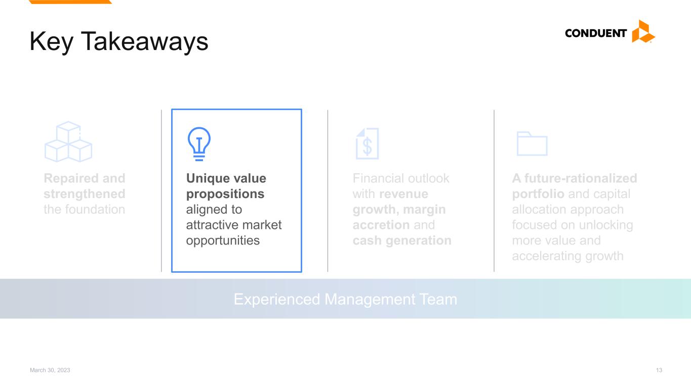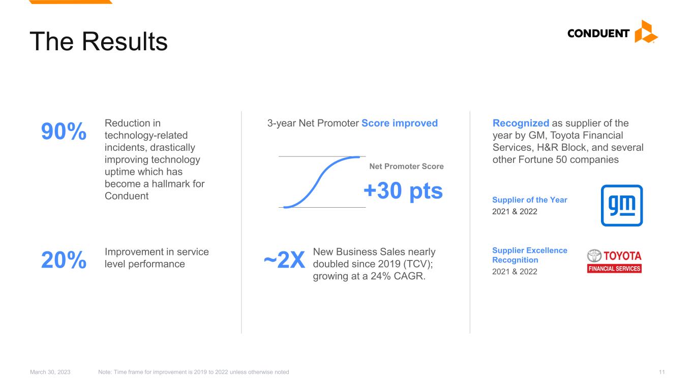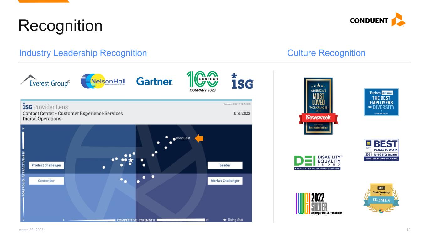 11 The Results Supplier Excellence Recognition 2021 & 2022 Supplier of the Year 2021 & 2022 +30 pts Net Promoter Score 90% 20% ~2XImprovement in service level performance Recognized as supplier of the year by GM, Toyota Financial Services, H&R Block, and several other Fortune 50 companies 3-year Net Promoter Score improved New Business Sales nearly doubled since 2019 (TCV); growing at a 24% CAGR. Reduction in technology-related incidents, drastically improving technology uptime which has become a hallmark for Conduent Note: Time frame for improvement is 2019 to 2022 unless otherwise noted March 30, 2023