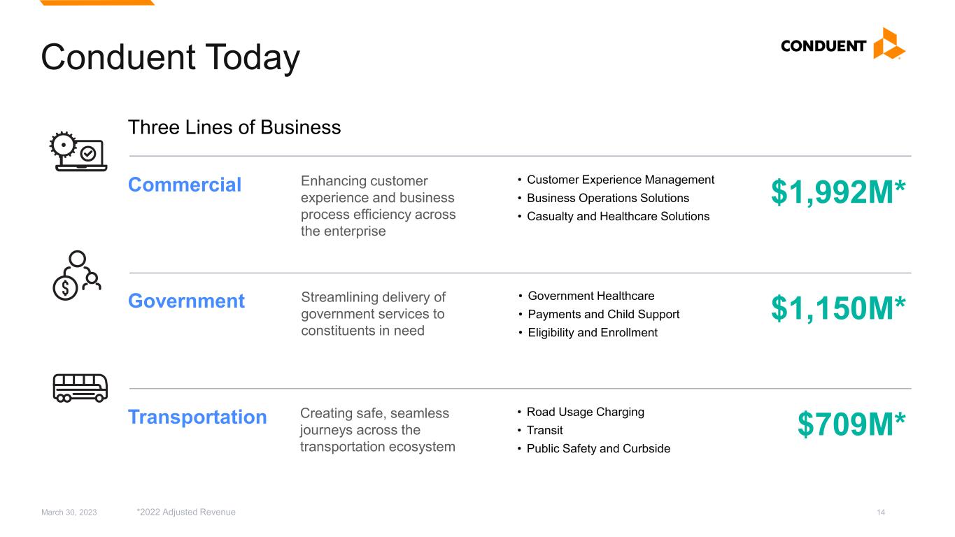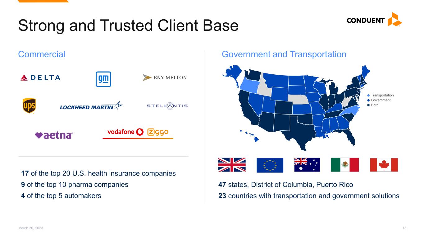 Conduent Today 14 Commercial Government Transportation Enhancing customer experience and business process efficiency across the enterprise Streamlining delivery of government services to constituents in need Creating safe, seamless journeys across the transportation ecosystem • Customer Experience Management • Business Operations Solutions • Casualty and Healthcare Solutions • Government Healthcare • Payments and Child Support • Eligibility and Enrollment • Road Usage Charging • Transit • Public Safety and Curbside Three Lines of Business $1,992M* $1,150M* $709M* *2022 Adjusted RevenueMarch 30, 2023
