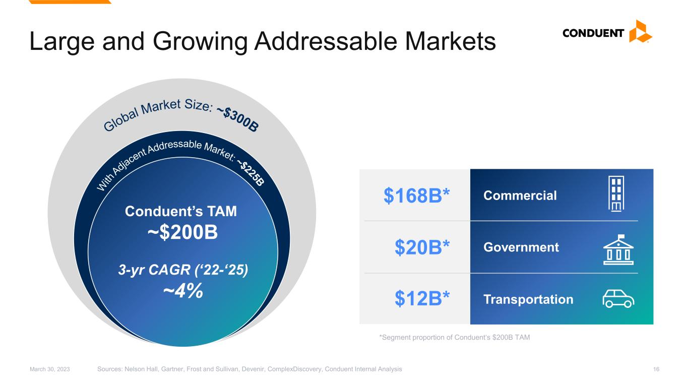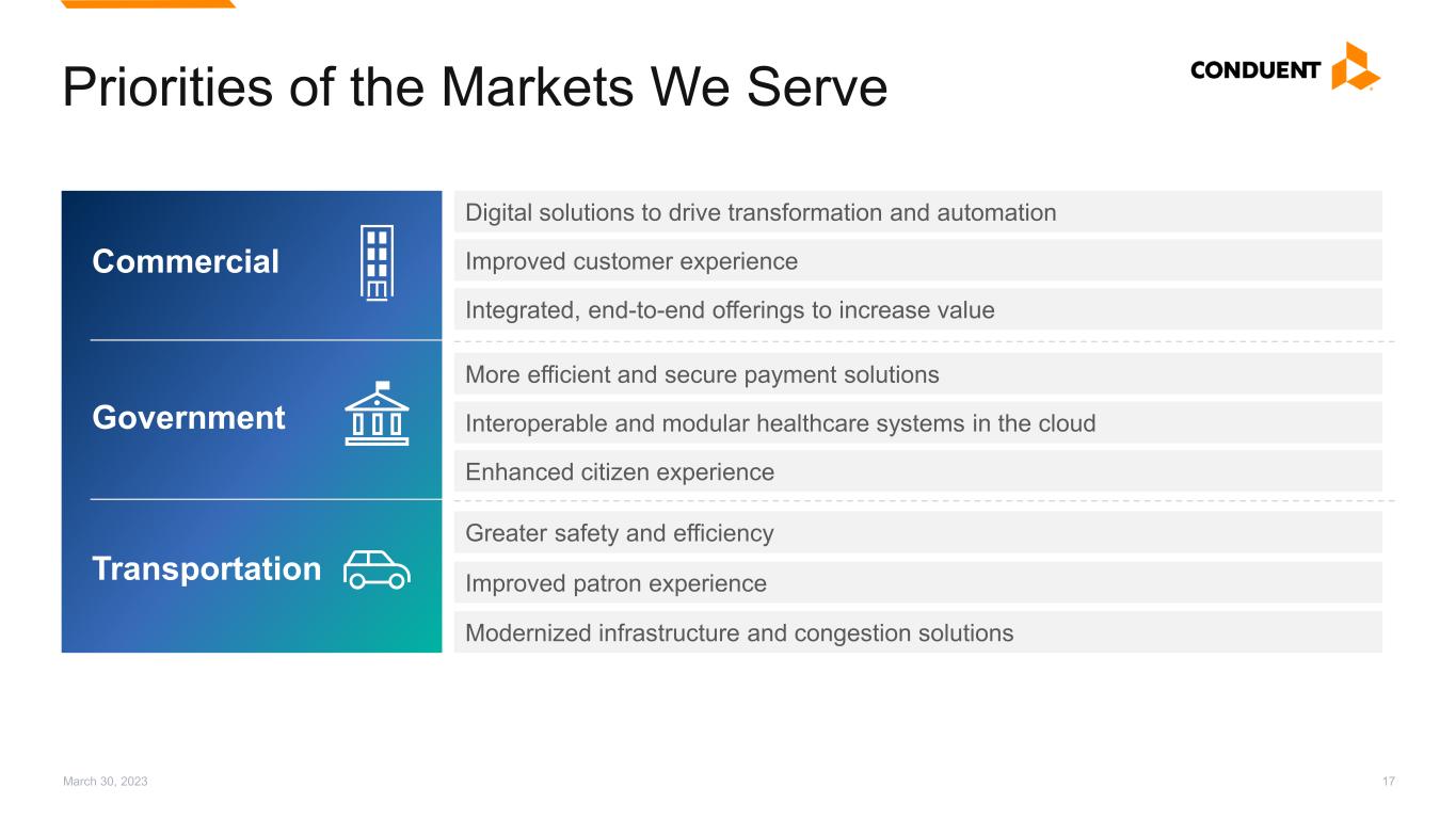 Commercial Government Transportation $168B* $20B* $12B* 16 Large and Growing Addressable Markets Sources: Nelson Hall, Gartner, Frost and Sullivan, Devenir, ComplexDiscovery, Conduent Internal Analysis Conduent’s TAM ~$200B 3-yr CAGR (‘22-‘25) ~4% *Segment proportion of Conduent‘s $200B TAM March 30, 2023