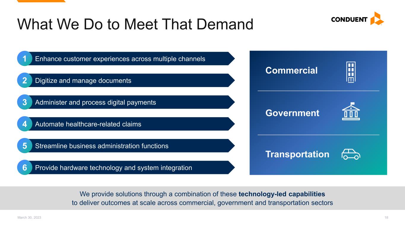 Digital solutions to drive transformation and automation Greater safety and efficiency More efficient and secure payment solutions Improved customer experience Improved patron experience Interoperable and modular healthcare systems in the cloud Integrated, end-to-end offerings to increase value Modernized infrastructure and congestion solutions Enhanced citizen experience Priorities of the Markets We Serve 17 Commercial Government Transportation March 30, 2023