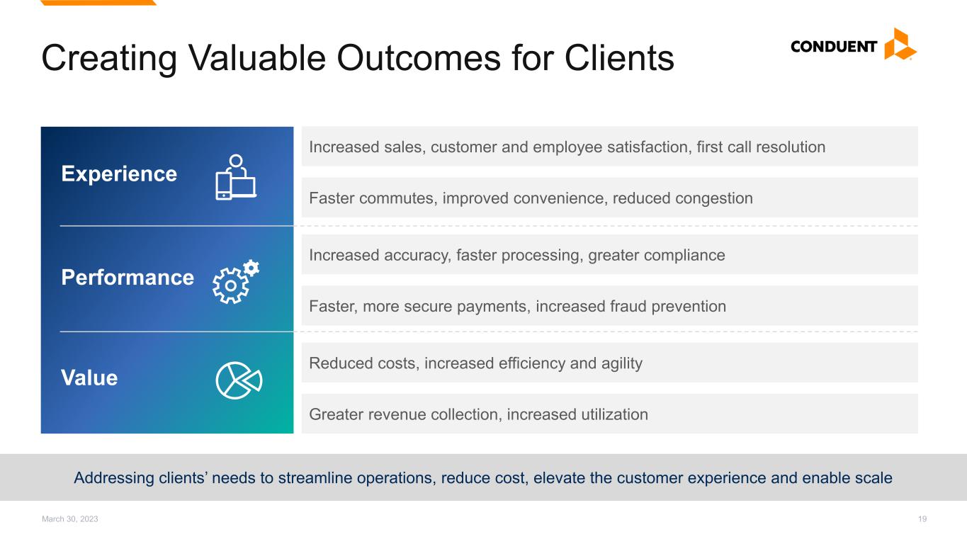 What We Do to Meet That Demand Enhance customer experiences across multiple channels1 Digitize and manage documents2 Administer and process digital payments3 Automate healthcare-related claims4 Streamline business administration functions5 Provide hardware technology and system integration6 Commercial Government Transportation We provide solutions through a combination of these technology-led capabilities to deliver outcomes at scale across commercial, government and transportation sectors 18March 30, 2023