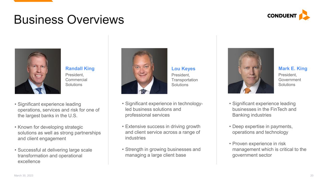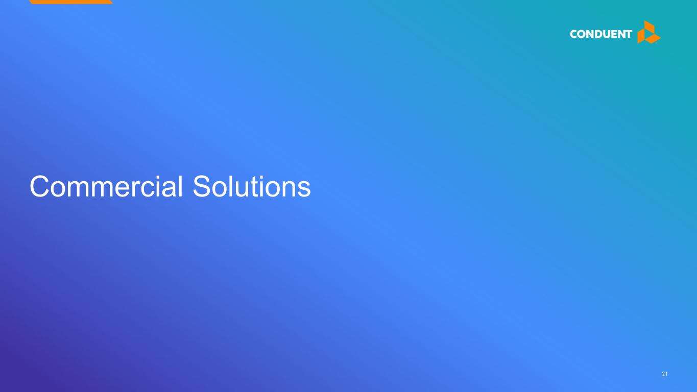 20 Business Overviews Randall King President, Commercial Solutions Mark E. King President, Government Solutions Lou Keyes President, Transportation Solutions • Significant experience in technology- led business solutions and professional services • Extensive success in driving growth and client service across a range of industries • Strength in growing businesses and managing a large client base • Significant experience leading businesses in the FinTech and Banking industries • Deep expertise in payments, operations and technology • Proven experience in risk management which is critical to the government sector • Significant experience leading operations, services and risk for one of the largest banks in the U.S. • Known for developing strategic solutions as well as strong partnerships and client engagement • Successful at delivering large scale transformation and operational excellence March 30, 2023