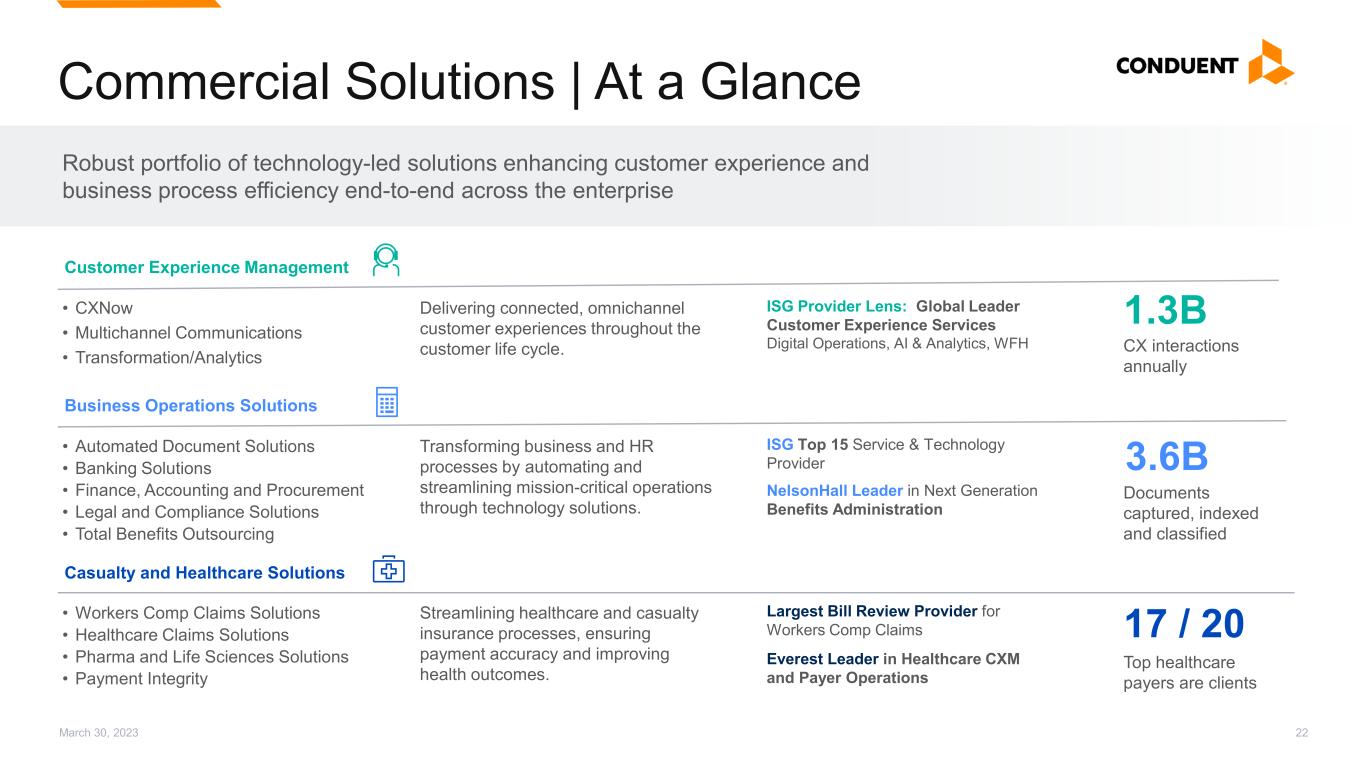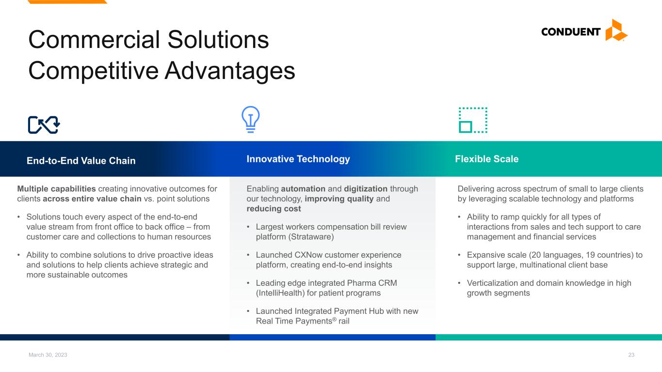 22 Commercial Solutions | At a Glance Documents captured, indexed and classified ISG Provider Lens: Global Leader Customer Experience Services Digital Operations, AI & Analytics, WFH ISG Top 15 Service & Technology Provider NelsonHall Leader in Next Generation Benefits Administration Largest Bill Review Provider for Workers Comp Claims Everest Leader in Healthcare CXM and Payer Operations Customer Experience Management Business Operations Solutions Casualty and Healthcare Solutions • CXNow • Multichannel Communications • Transformation/Analytics • Automated Document Solutions • Banking Solutions • Finance, Accounting and Procurement • Legal and Compliance Solutions • Total Benefits Outsourcing • Workers Comp Claims Solutions • Healthcare Claims Solutions • Pharma and Life Sciences Solutions • Payment Integrity 3.6B Top healthcare payers are clients 17 / 20 Robust portfolio of technology-led solutions enhancing customer experience and business process efficiency end-to-end across the enterprise Delivering connected, omnichannel customer experiences throughout the customer life cycle. CX interactions annually 1.3B Transforming business and HR processes by automating and streamlining mission-critical operations through technology solutions. Streamlining healthcare and casualty insurance processes, ensuring payment accuracy and improving health outcomes. March 30, 2023