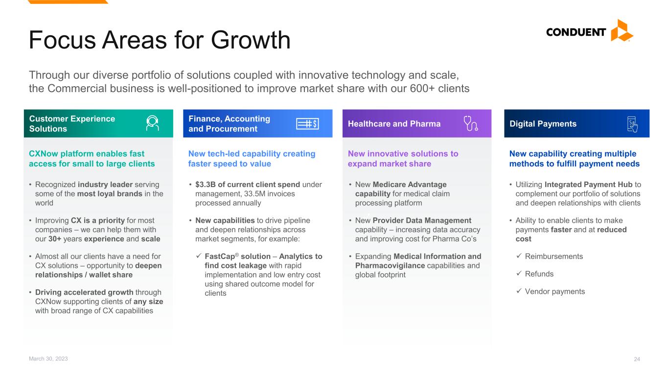 23 Commercial Solutions Competitive Advantages Flexible ScaleInnovative TechnologyEnd-to-End Value Chain Delivering across spectrum of small to large clients by leveraging scalable technology and platforms • Ability to ramp quickly for all types of interactions from sales and tech support to care management and financial services • Expansive scale (20 languages, 19 countries) to support large, multinational client base • Verticalization and domain knowledge in high growth segments Enabling automation and digitization through our technology, improving quality and reducing cost • Largest workers compensation bill review platform (Strataware) • Launched CXNow customer experience platform, creating end-to-end insights • Leading edge integrated Pharma CRM (IntelliHealth) for patient programs • Launched Integrated Payment Hub with new Real Time Payments® rail Multiple capabilities creating innovative outcomes for clients across entire value chain vs. point solutions • Solutions touch every aspect of the end-to-end value stream from front office to back office – from customer care and collections to human resources • Ability to combine solutions to drive proactive ideas and solutions to help clients achieve strategic and more sustainable outcomes March 30, 2023