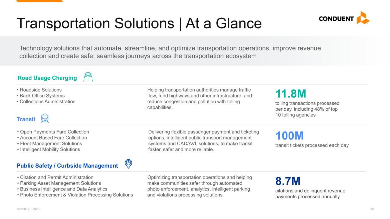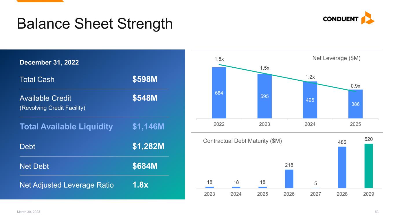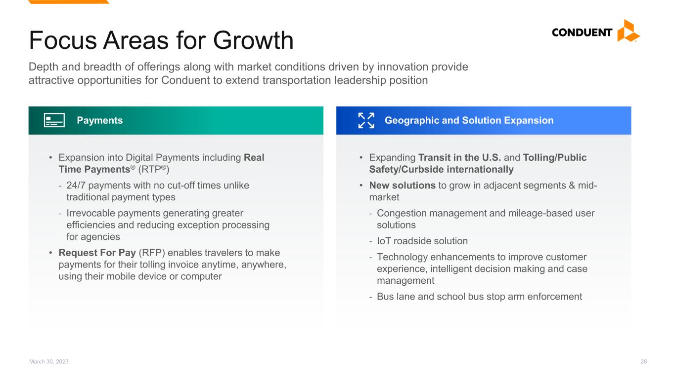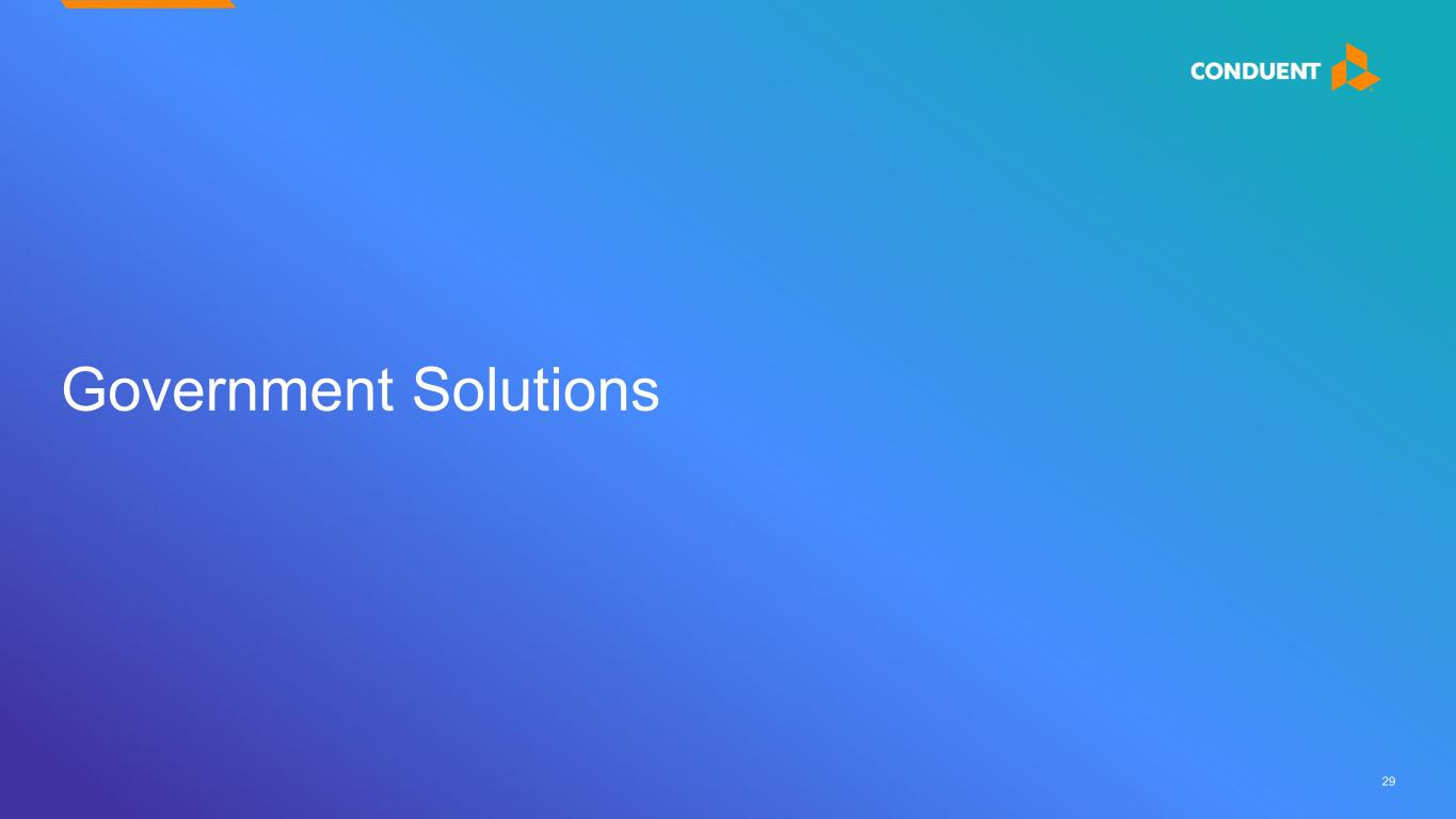 28 Focus Areas for Growth Depth and breadth of offerings along with market conditions driven by innovation provide attractive opportunities for Conduent to extend transportation leadership position Payments Geographic and Solution Expansion • Expansion into Digital Payments including Real Time Payments® (RTP®) - 24/7 payments with no cut-off times unlike traditional payment types - Irrevocable payments generating greater efficiencies and reducing exception processing for agencies • Request For Pay (RFP) enables travelers to make payments for their tolling invoice anytime, anywhere, using their mobile device or computer • Expanding Transit in the U.S. and Tolling/Public Safety/Curbside internationally • New solutions to grow in adjacent segments & mid- market - Congestion management and mileage-based user solutions - IoT roadside solution - Technology enhancements to improve customer experience, intelligent decision making and case management - Bus lane and school bus stop arm enforcement March 30, 2023