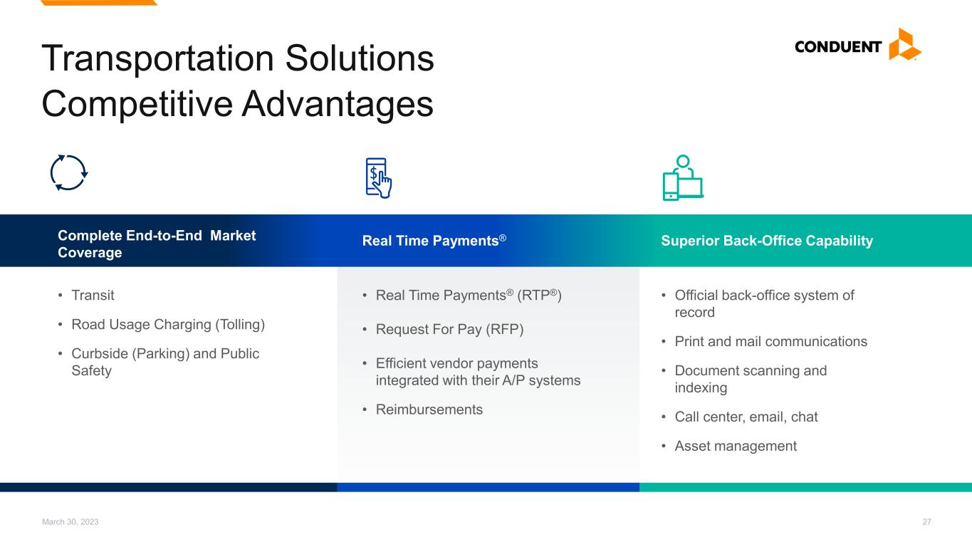 26 Transportation Solutions | At a Glance 11.8M tolling transactions processed per day, including 48% of top 10 tolling agencies 100M transit tickets processed each day 8.7M citations and delinquent revenue payments processed annually Road Usage Charging Transit Public Safety / Curbside Management • Roadside Solutions • Back Office Systems • Collections Administration • Open Payments Fare Collection • Account Based Fare Collection • Fleet Management Solutions • Intelligent Mobility Solutions • Citation and Permit Administration • Parking Asset Management Solutions • Business Intelligence and Data Analytics • Photo Enforcement & Violation Processing Solutions Technology solutions that automate, streamline, and optimize transportation operations, improve revenue collection and create safe, seamless journeys across the transportation ecosystem Helping transportation authorities manage traffic flow, fund highways and other infrastructure, and reduce congestion and pollution with tolling capabilities. Delivering flexible passenger payment and ticketing options, intelligent public transport management systems and CAD/AVL solutions, to make transit faster, safer and more reliable. Optimizing transportation operations and helping make communities safer through automated photo enforcement, analytics, intelligent parking and violations processing solutions. March 30, 2023