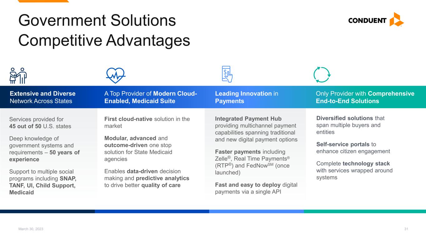 Government Healthcare Payments and Child Support Eligibility and Enrollment 30 30 Government Solutions | At a Glance 588M Claims processed in 2022 • Conduent Medicaid Suite • Pharmacy Benefits Management • Maven Disease Surveillance Tracking $106B In benefits disbursed in 2022 • Card Programs • State Disbursement Units • Child Support Enforcement IT • Digital Integrated Payment Hub 32M U.S. residents supported across different programs • Eligibility Application Processing • Enrollment Broker Platform • Eligibility Customer Care Helping government agencies in 45 states automate and optimize the delivery of healthcare and social services to better serve residents, patients, families, and individuals Delivering program administration solutions for government-funded healthcare programs that reduce costs, streamline operations, increase program participation and improve compliance. Enabling agencies to meet their mission of delivering accurate, convenient, secure payments to the individuals who need them - from SNAP and TANF benefits to child support, pension and unemployment insurance payments. Helping agencies streamline enrollment, determine eligibility, proactively engage constituents and enable seamless access to benefits and programs, while ensuring alignment with program regulations. March 30, 2023