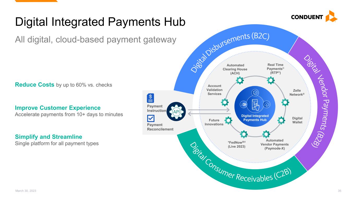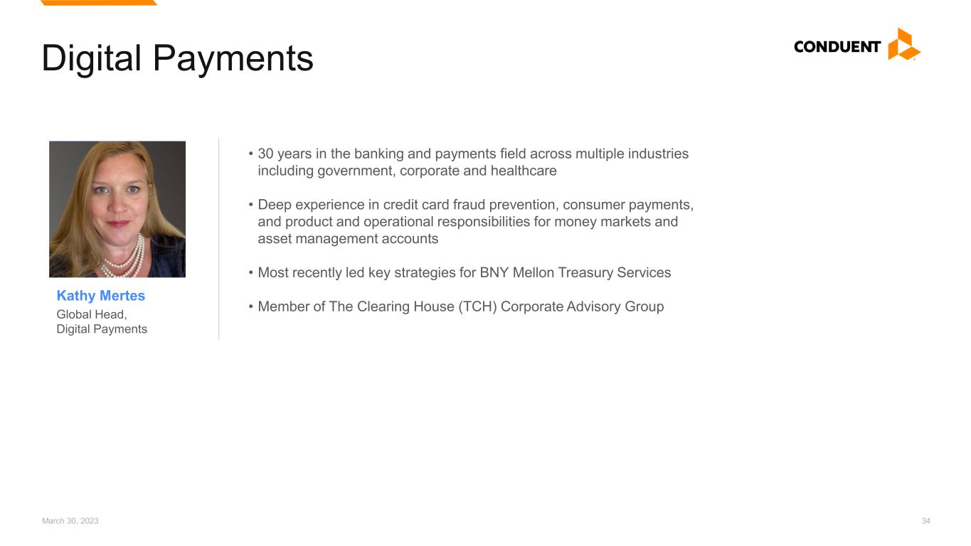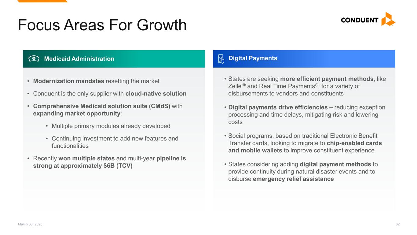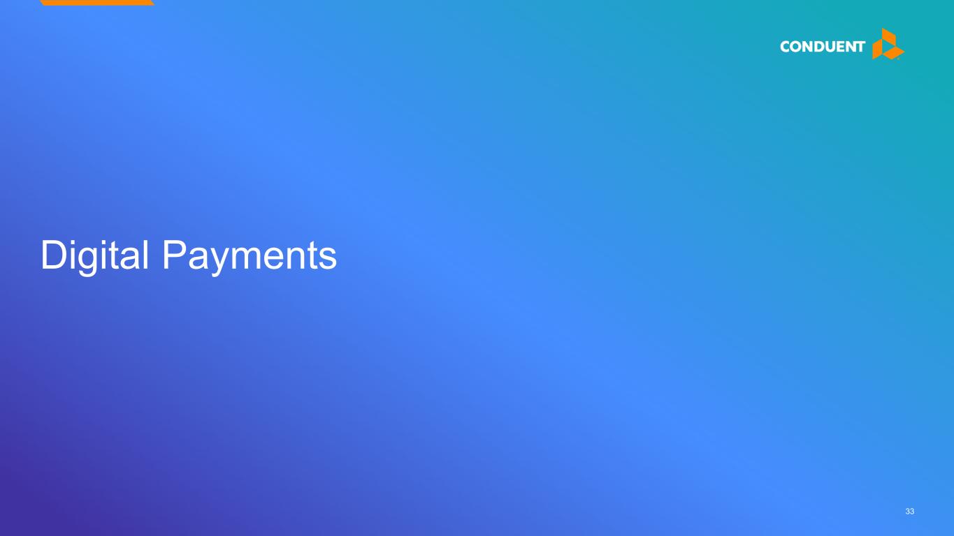 32 Focus Areas For Growth Medicaid Administration • Modernization mandates resetting the market • Conduent is the only supplier with cloud-native solution • Comprehensive Medicaid solution suite (CMdS) with expanding market opportunity: • Multiple primary modules already developed • Continuing investment to add new features and functionalities • Recently won multiple states and multi-year pipeline is strong at approximately $6B (TCV) Digital Payments • States are seeking more efficient payment methods, like Zelle ® and Real Time Payments®, for a variety of disbursements to vendors and constituents • Digital payments drive efficiencies – reducing exception processing and time delays, mitigating risk and lowering costs • Social programs, based on traditional Electronic Benefit Transfer cards, looking to migrate to chip-enabled cards and mobile wallets to improve constituent experience • States considering adding digital payment methods to provide continuity during natural disaster events and to disburse emergency relief assistance March 30, 2023