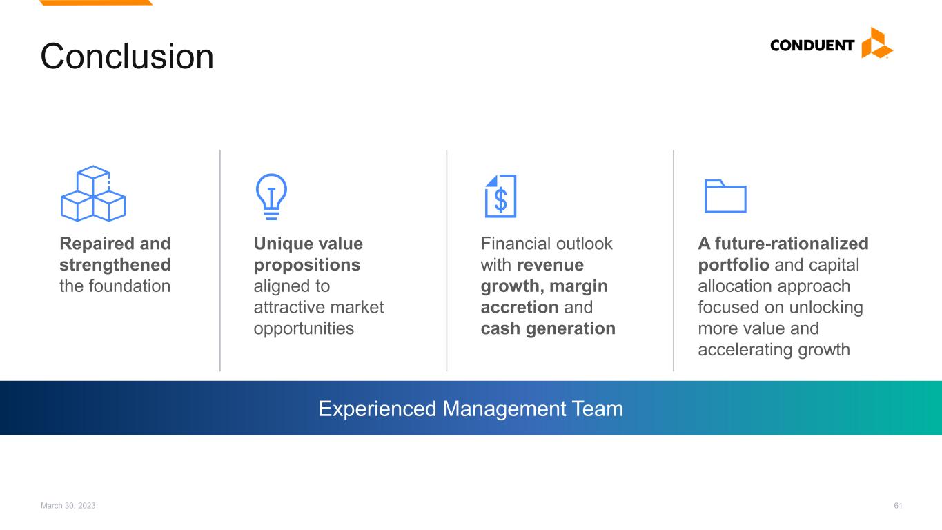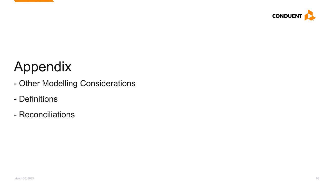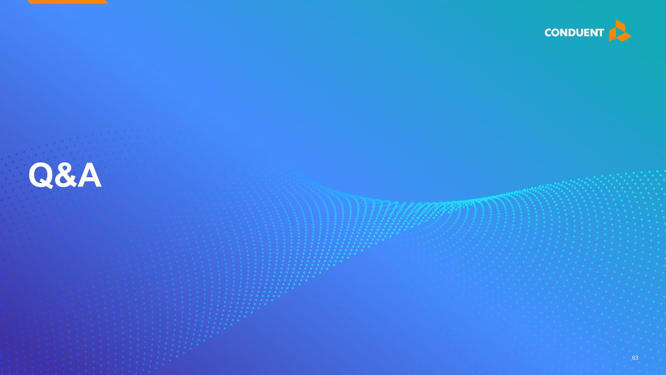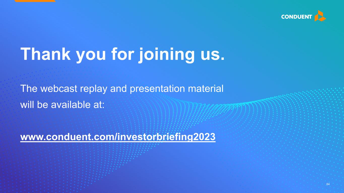 Thank you for joining us. The webcast replay and presentation material will be available at: www.conduent.com/investorbriefing2023 64