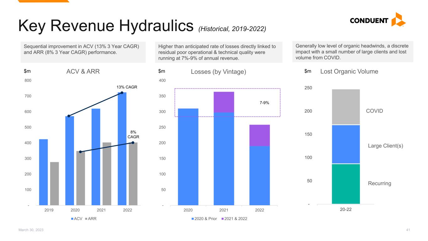 40 Key Revenue Hydraulics (Historical, 2019-2022) - 100 200 300 400 500 600 700 800 2019 2020 2021 2022 ACV & ARR ACV ARR - 50 100 150 200 250 300 350 400 2020 2021 2022 Losses (by Vintage) 2020 & Prior 2021 & 2022 Sequential improvement in ACV (13% 3 Year CAGR) and ARR (8% 3 Year CAGR) performance. Higher than anticipated rate of losses directly linked to residual poor operational and technical quality were running at 7%-9% of annual revenue. 7-9% 13% CAGR 8% CAGR $m $m March 30, 2023