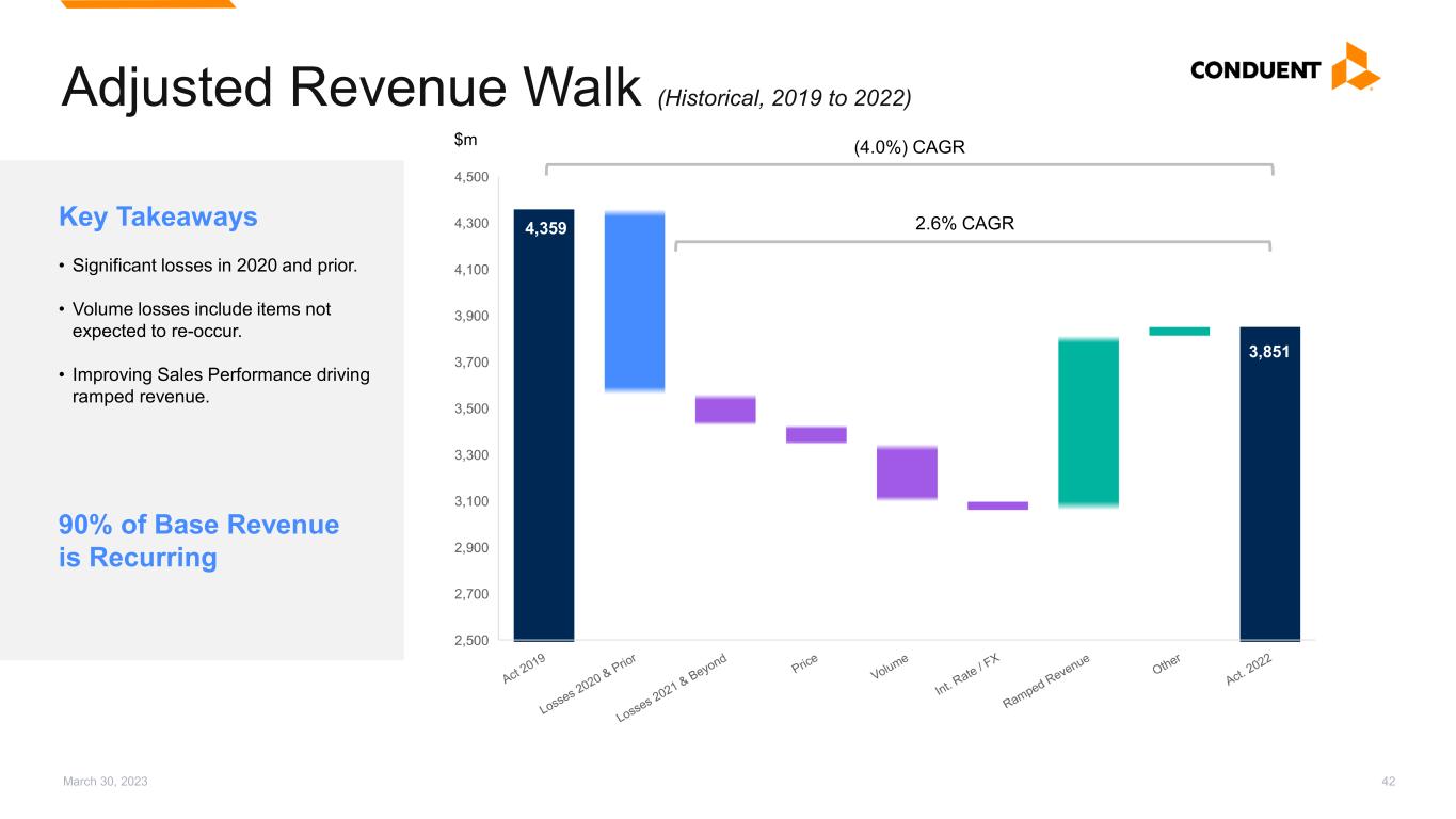41 Key Revenue Hydraulics (Historical, 2019-2022) - 100 200 300 400 500 600 700 800 2019 2020 2021 2022 ACV & ARR ACV ARR - 50 100 150 200 250 300 350 400 2020 2021 2022 Losses (by Vintage) 2020 & Prior 2021 & 2022 Sequential improvement in ACV (13% 3 Year CAGR) and ARR (8% 3 Year CAGR) performance. Higher than anticipated rate of losses directly linked to residual poor operational & technical quality were running at 7%-9% of annual revenue. 7-9% Generally low level of organic headwinds, a discrete impact with a small number of large clients and lost volume from COVID. 13% CAGR 8% CAGR Lost Organic Volume Recurring Large Client(s) COVID $m $m $m March 30, 2023